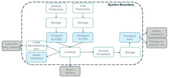 Figure 6. Illustration of System Boundary for Loading the whole Propellant Required for the Mission into the Space System: In this diagram, green elements are modeled using the ESA database. Blue elements represent direct inputs from the Ecoinvent v3 cut-off allocation background database. Grey elements indicate final products or activities that are outside the system’s boundaries.