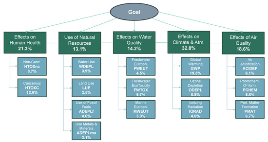 In the following sections, LCA results are presented for each propulsion option, showing both the characterization values for individual impact indicators and the overall AHP-based score, displayed as the leftmost bar in each graph. To compute this single score, individual indicator results were first normalized according to the Product Environmental Footprint (PEF) guidelines [32], which scale each impact relative to a reference value representing the average annual environmental footprint per global citizen, based on United Nations data. These normalized values were then weighted using the AHP-derived scores shown in Figure 7 and summed to produce the final single environmental performance score.