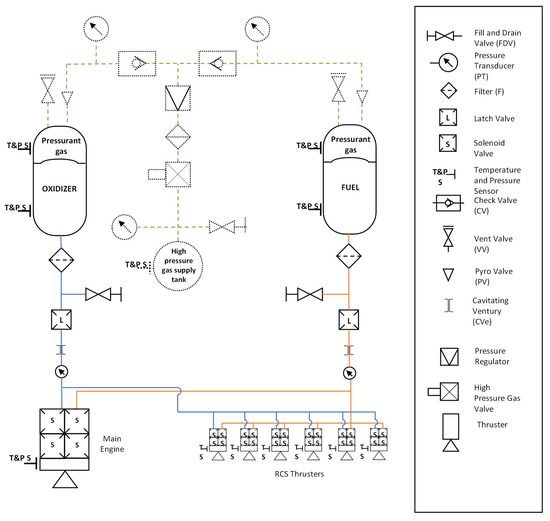 To assess the environmental impacts of different propulsion system configurations, this study defines and analyzes a baseline liquid bipropellant system architecture. The reference setup, illustrated in Figure 8, includes all components necessary for nominal operation and serves as baseline for comparing the environmental performance of alterative architectures tailored to different propellant combinations.
