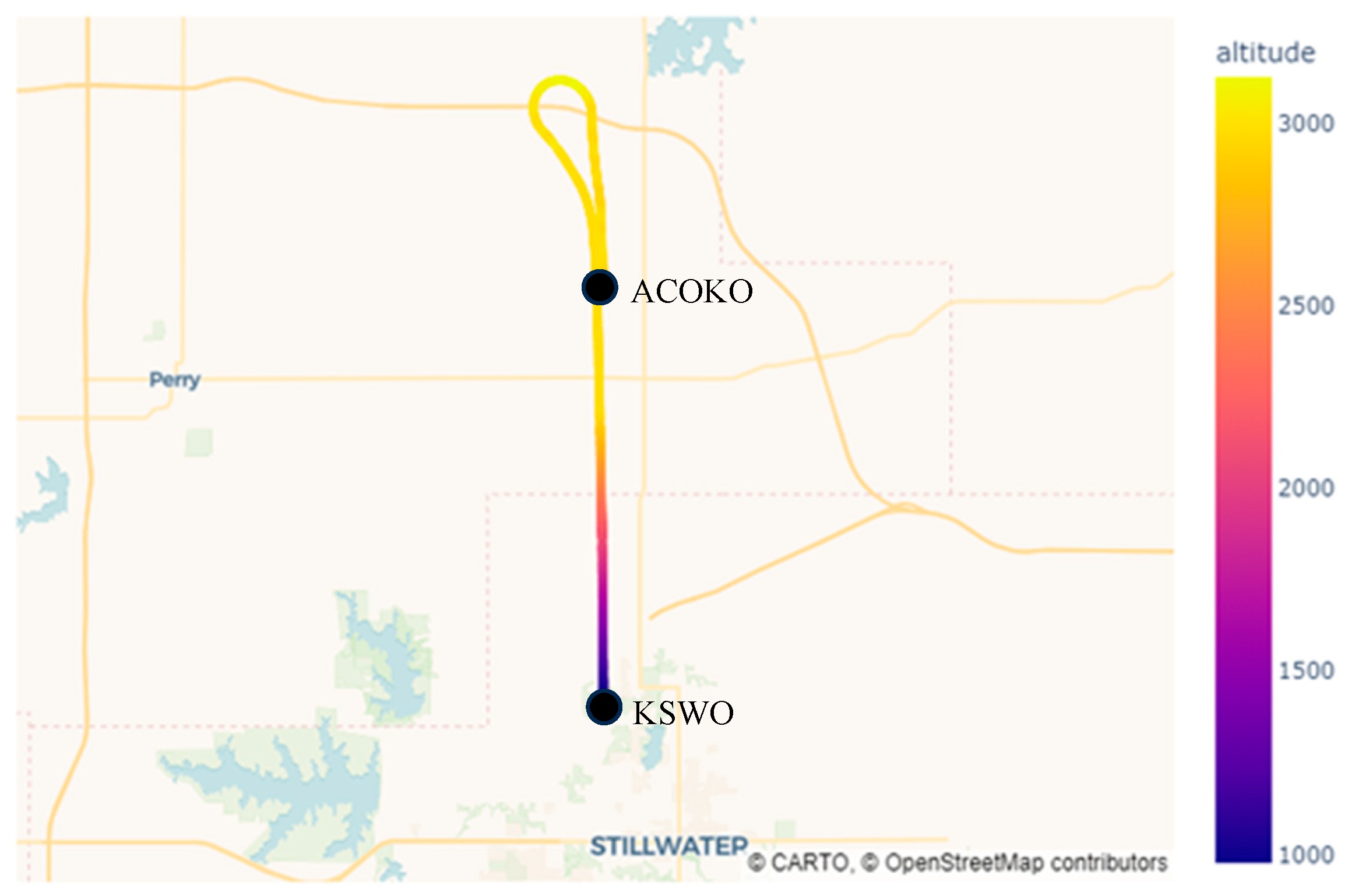 Figure 2 displays the flight path for one participant. The outbound portion from KSWO RWY 17 to ACOKO did not include n-back activity. After completion of the turn-around maneuver, the n-back task was started and consequently concluded after landing back at KSWO. Boxcar functions were generated for automation status and workload level throughout the continuous physiological data recordings and used to segment the data into conditions based on the experimental context.