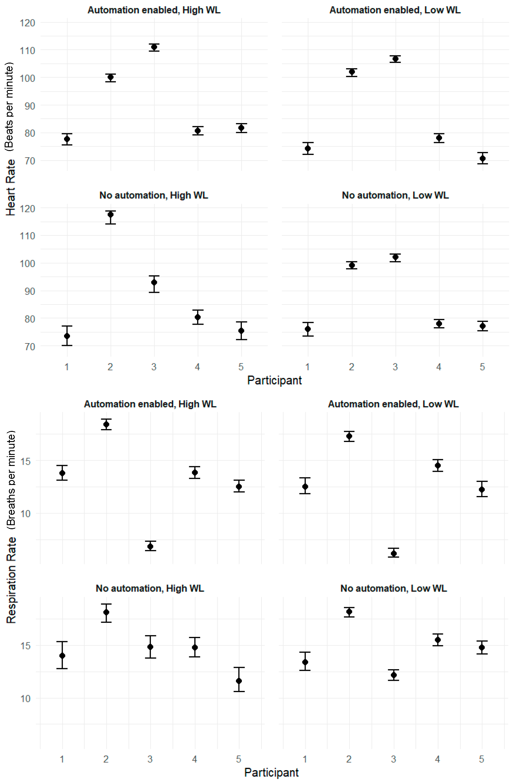 Figure 3. The participants’ physiological responses varied noticeably throughout the experiment. Some participants demonstrated substantial differences across conditions, for instance, participant 5’s WL estimates, while others showed more minimal changes, such as in participant 1’s HR across conditions. Overall, there was more variation present for all three physiological variables during the Automation Off/Workload High condition, as shown in the bottom left plot in each set of plots.