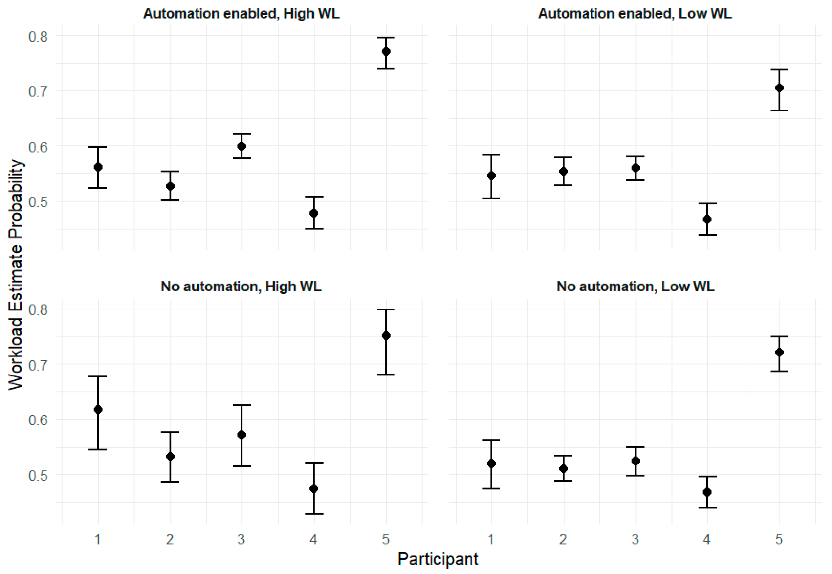 A key advantage of this framework is its ability to accommodate individual variability without discarding it as statistical noise. For example, while most participants showed elevated heart rate under high workload with automation, one deviated from this trend: an effect that traditional averaging methods would obscure. By modeling posterior distributions rather than single-point estimates, the Bayesian approach offers nuanced, data-efficient predictions. For instance, participant 5 exhibited a distinct local heart rate maximum near 82 BPM under the Automation On/Workload High condition, yet their overall mean heart rate more closely aligned with the Automation Off/Workload High condition, which produced a global maximum near 75 BPM. These observations suggest the presence of semi-stationary elevated workload states that manifest differently across task contexts, with extended periods of physiologically distinct responses.
