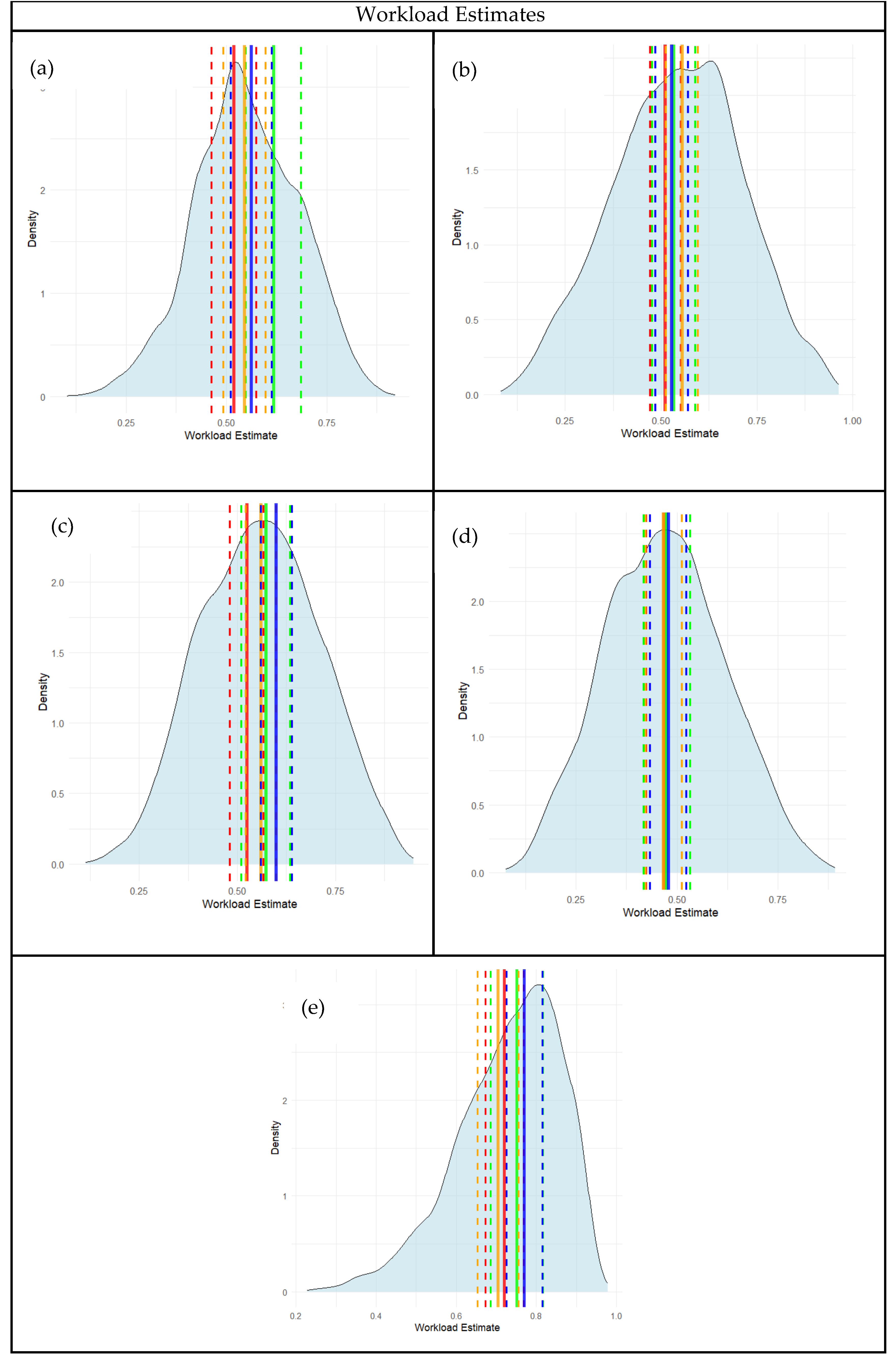 With the complete posterior distribution over all experimental conditions, several pieces of information can be gathered from the model. For HR, observed values for all participants generally fell within the high-density regions of the posterior distributions and were encompassed by the 95% CIs, suggesting well-calibrated and reliable estimates. Participants 1 and 5 exhibited particularly tight HR posterior distributions with close alignment between predicted and observed values. In contrast, RR predictions showed greater variability across participants. Several posterior distributions—most notably for participants 3, 4, and 5—were skewed or multimodal, and observed values occasionally fell near the tails of the distributions, indicating increased uncertainty and reduced precision for RR. Workload predictions showed more consistent performance. The posterior distributions for WL were relatively symmetric and narrow, with observed values frequently aligning with the posterior modes for all participants. WL posterior credible intervals were more centered in the observed distributions, failing to capture densities on the tails of the workload estimate distributions. Overall, model performance appeared strongest for HR and WL, with greater variability and lower confidence in RR estimates—consistent with trends observed in the quantitative prediction diagnostics.