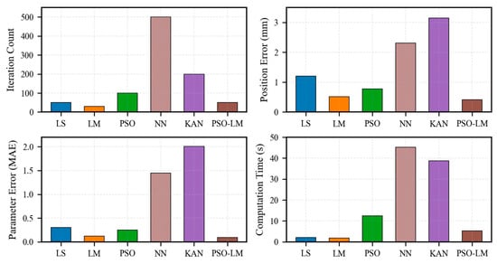 Kinematic parameter identification is inherently a nonlinear optimization problem. To comprehensively evaluate the performance of various algorithms, a systematic comparative analysis of classical calibration methods, evolutionary optimization algorithms, and hybrid approaches is essential. Established techniques include Least Squares (LS), the Levenberg–Marquardt (LM) algorithm, Backpropagation (BP) Neural Networks, Kolmogorov-Arnold Networks (KAN), and standard Particle Swarm Optimization (PSO). As one of the earliest methods applied to kinematic calibration, LS gained widespread adoption due to its computational simplicity. However, its identification accuracy is susceptible to measurement noise and model linearization errors, often leading to convergence to local optima. Antonelli et al. [] developed an LS-based calibration method for mobile robots and experimentally validated its effectiveness. To address persistent accuracy degradation in industrial robots post-calibration, [] introduced a continuous calibration approach utilizing Recursive Least Squares (RLS), enhancing both precision and efficiency.
