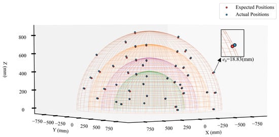 As illustrated in Figure 6 (where red circles represent desired theoretical positions based on nominal kinematics and blue circles indicate actual end-effector positions measured by the metrology system), the pre-calibration spatial error distribution demonstrated significant dispersion across all axes: X-axis (−15.87 to 11.38 mm), Y-axis (−13.93 to 16.07 mm), and Z-axis (−16.01 to 14.25 mm). Statistical analysis revealed a mean error norm of 11.63 ± 4.12 mm, with the maximum deviation of 18.83 mm occurring at measurement point 5, highlighting substantial positioning inaccuracies prior to kinematic calibration.