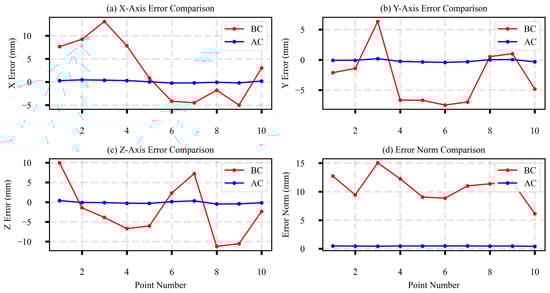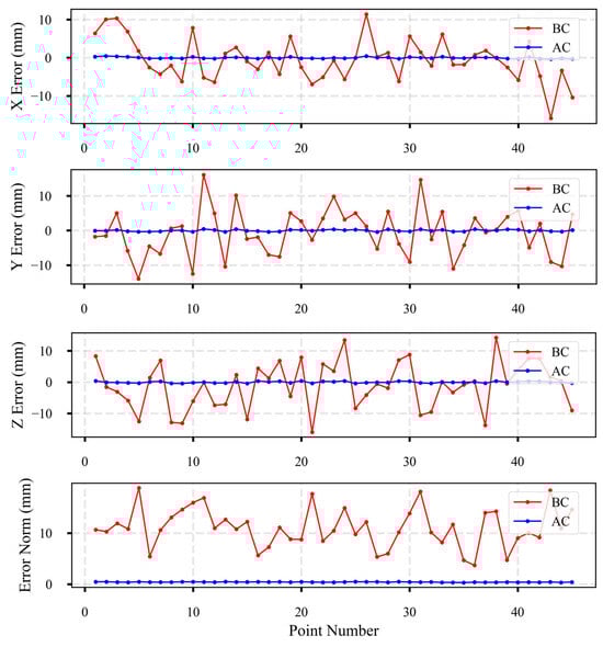 The calibrated DH parameters were implemented in the manipulator model, and the resulting geometric errors before and after calibration are illustrated in Figure 7. It demonstrates the significant improvement in positioning accuracy achieved through the proposed calibration method, where the red line (BC: Before Calibration) and blue line (AC: After Calibration) represent the error distributions along each axis.
