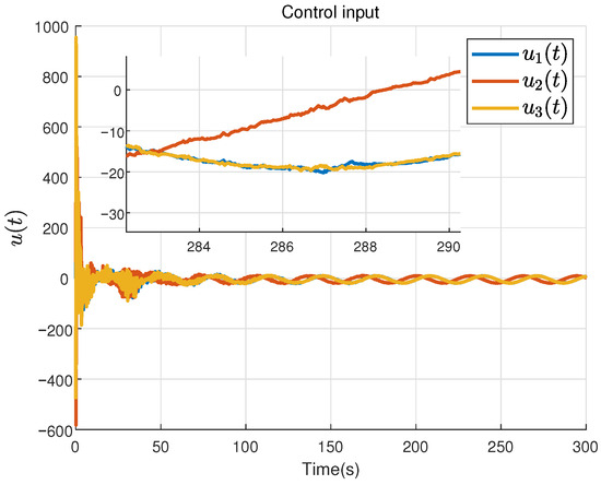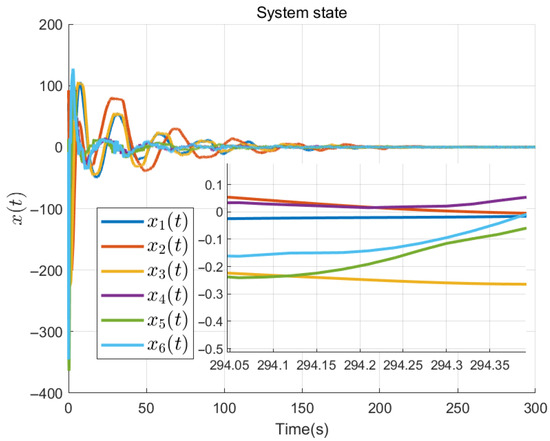 Integrating (32) in the interval for all , (21) is obtained. This implies that exponentially converge to a bounded constant . By selecting , inequality (22) can be converted to the LMI (20) according to the Schur’s supplementary in Lemma 2. Furthermore, (18) and (19) hold for any . Therefore, estimation error system (16) is uniformly bounded stable. This completes the proof. □