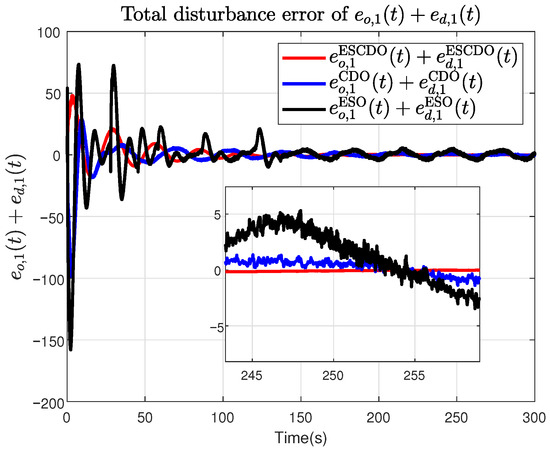 To more clearly demonstrate the effectiveness of the proposed ESCDO, the conventional CDO in [22] and ESO in [34] are used as baselines for comparison. The comparison focuses primarily on the estimation accuracy of the lumped disturbance (overall disturbance estimation error) and the root-mean-square error (RMSE). The parameters used for ESCDO, CDO, and ESO in the comparative simulations are listed in Table 1. Since the quantity that ultimately affects the closed-loop system is the estimation error , is adopted as the comparison criterion. The results are shown in Figure 13, Figure 14 and Figure 15. In Figure 13, Figure 14 and Figure 15, and () represent the i-the element of and , respectively. Superscripts ESCDO, CDO and ESO denote the errors obtained under observers ESCDO, CDO and ESO, respectively. In addition, we analyze the estimation error under the RMSE metric, yielding the results in Figure 16, Figure 17 and Figure 18. Accordingly, the RMSE of at the end of the simulation under ESCDO, CDO and ESO is given in Table 2, respectively.