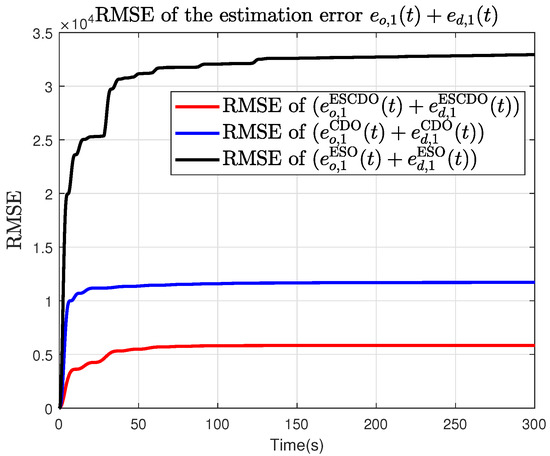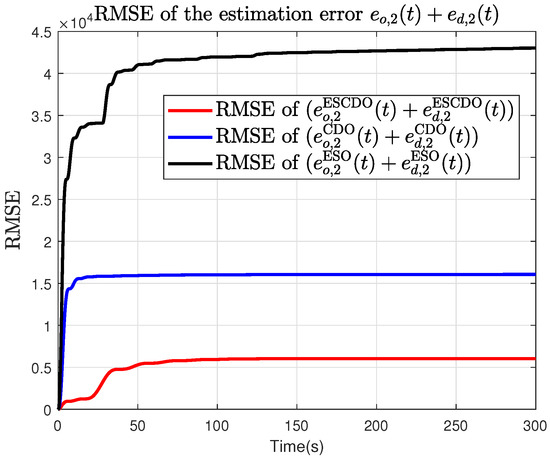 From Figure 13, Figure 14 and Figure 15, it can be seen that the proposed ESCDO yields the smallest disturbance estimation error , whereas the ESO-alone scheme performs the worst. Moreover, Figure 16, Figure 17 and Figure 18 show that the proposed ESCDO achieves the smallest RMSE, whereas the ESO method yields the largest RMSE. This indicates that, over the entire simulation horizon, the estimation accuracy of our approach surpasses that of both CDO and ESO, thereby further validating the effectiveness of the proposed method.