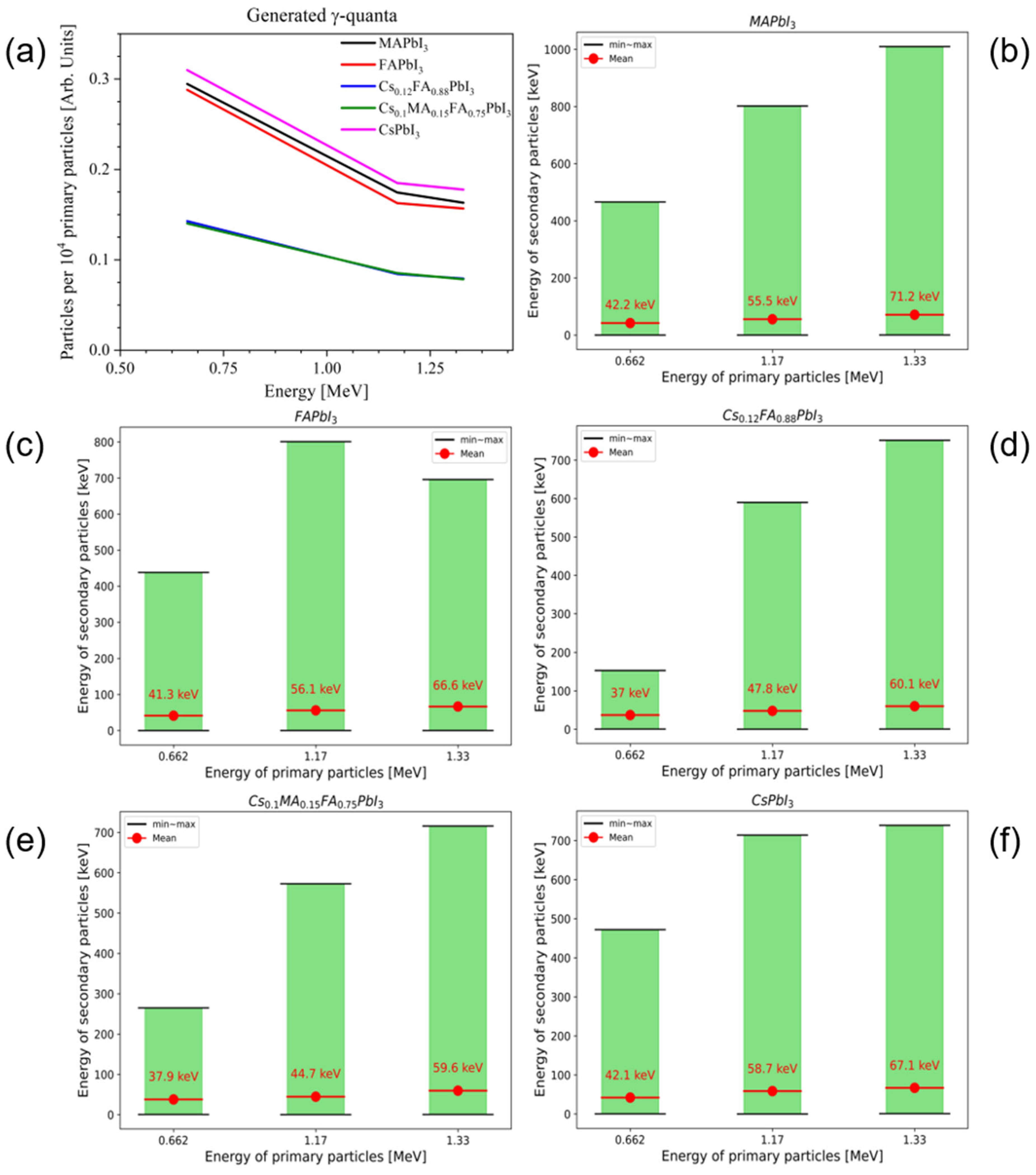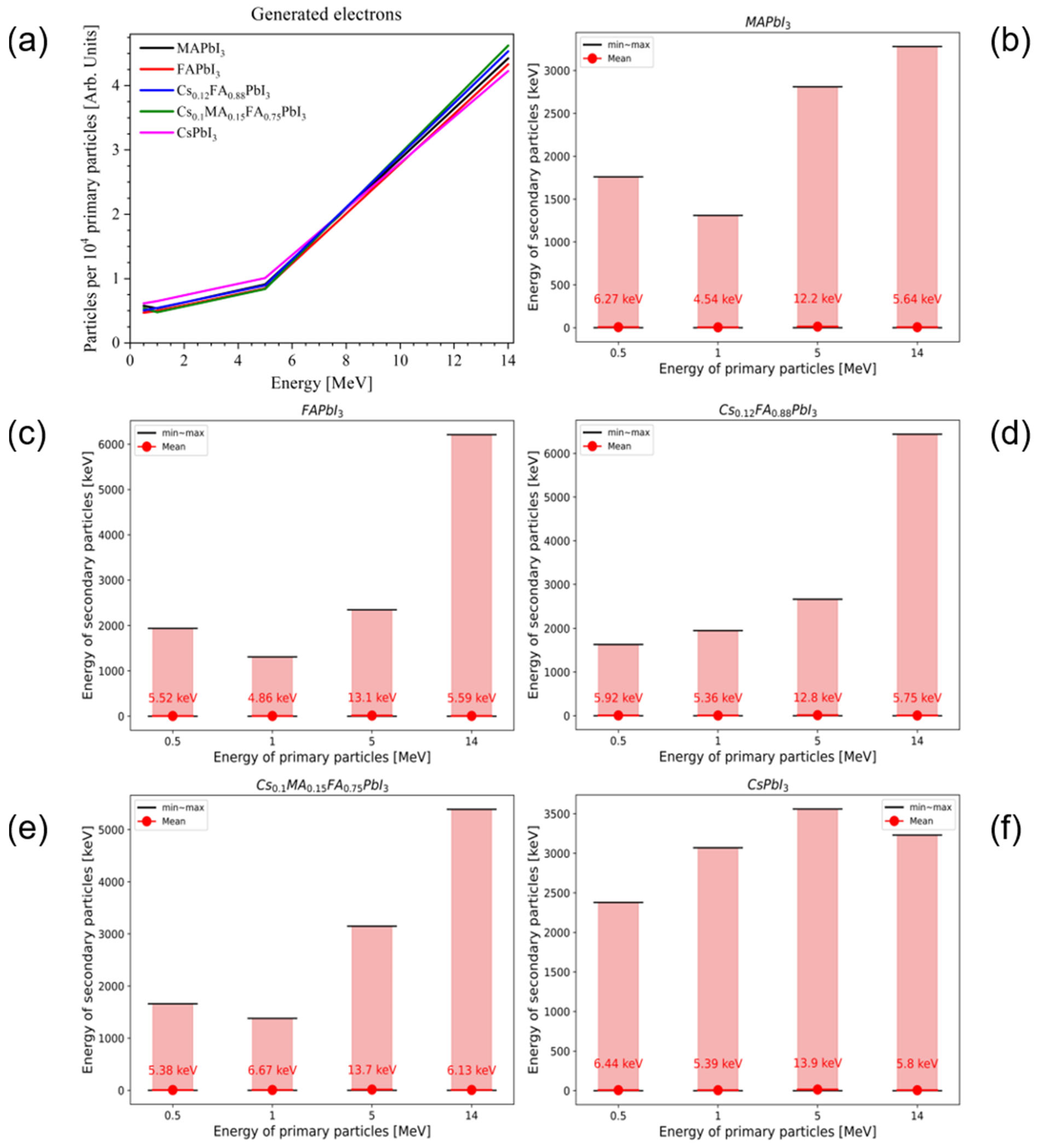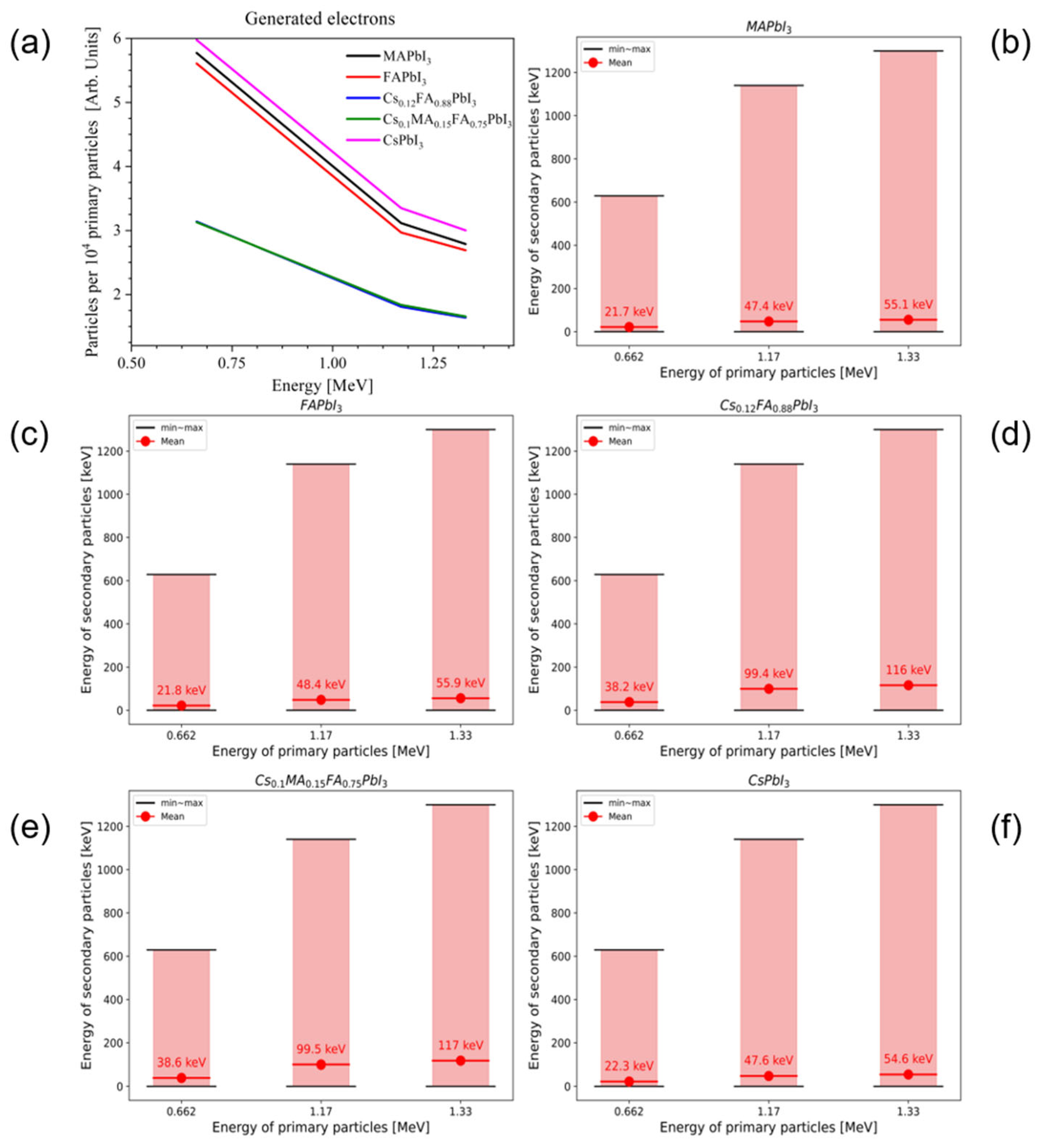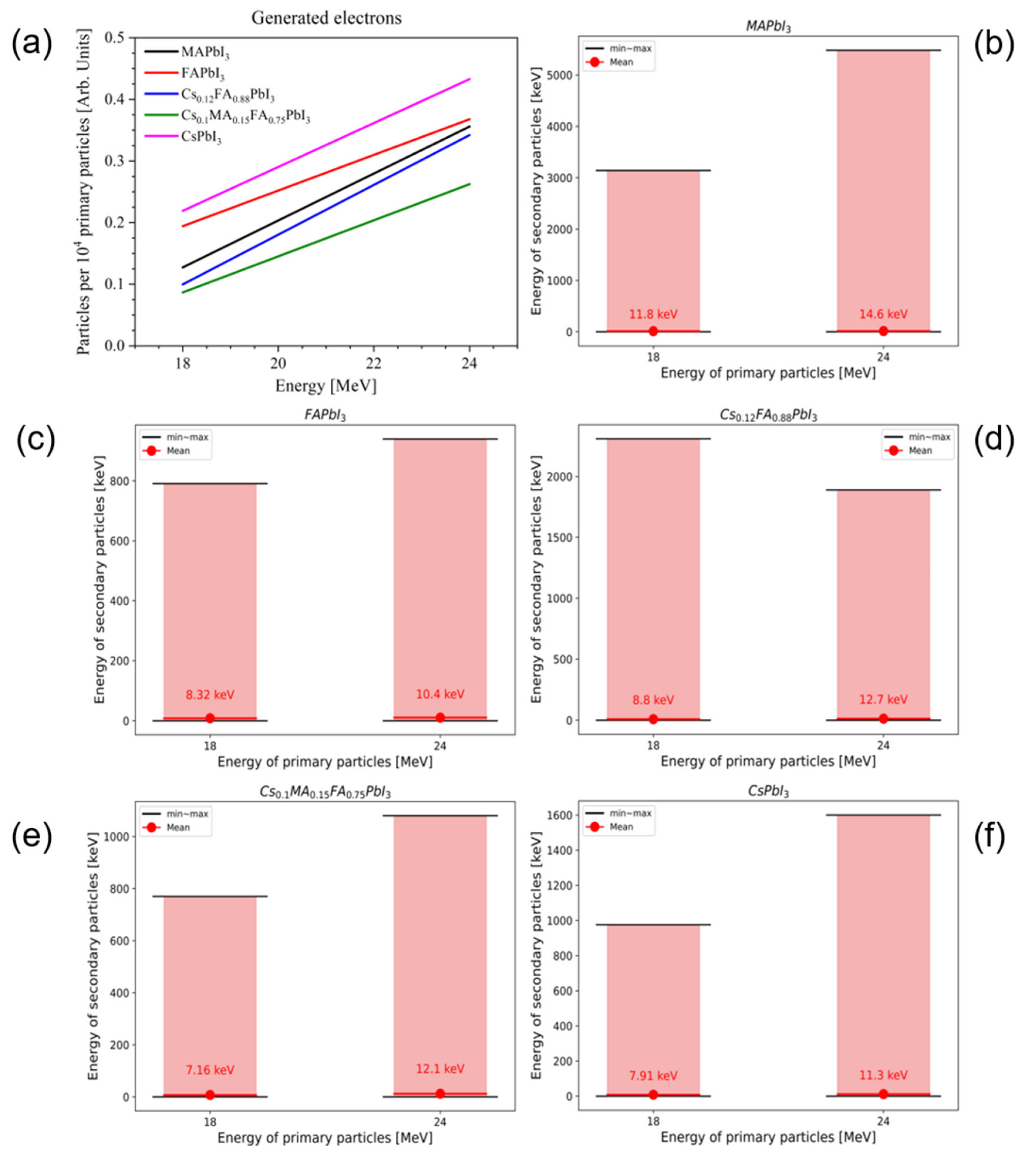 Moreover, since the photoelectric and Compton cross-sections scale with atomic number, CsPbI3 perovskite generates a larger number of secondary electrons compared with single organic-cation and mixed-cation compositions, where the effective Z is lower. In the single-cation perovskites (Figure 7b,c,f), the average energy of secondary particles is noticeably lower, while in the mixed systems (Figure 7d,e) it becomes roughly twice as high. This behavior can be attributed to reduced multiple scattering and weaker subsequent interactions within the more compositionally heterogeneous lattice, allowing individual electrons to retain a larger share of the photon energy and thus forming fewer but more energetic secondary particles.