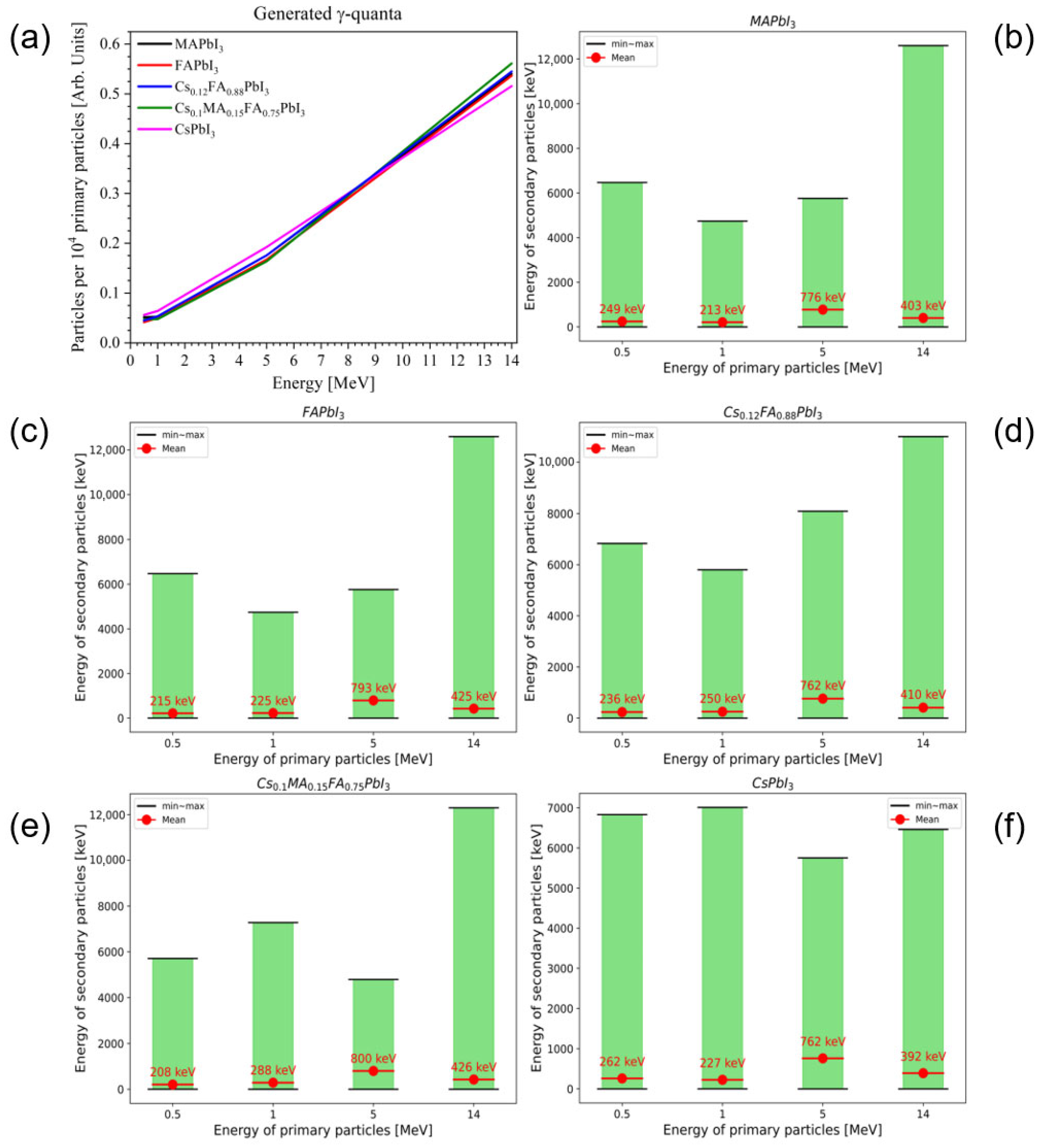 At lower proton energies, secondary γ-rays are not observed. The average energy of secondary particles is higher for mixed-cation systems, while CsPbI3 demonstrates the lowest average energy. FAPbI3 exhibits the widest range between minimum and maximum values. At 24 MeV, MAPbI3 and mixed-cation perovskites show higher average energies compared to other single-cation systems, which exhibit comparable averages and ranges between minimum and maximum values.