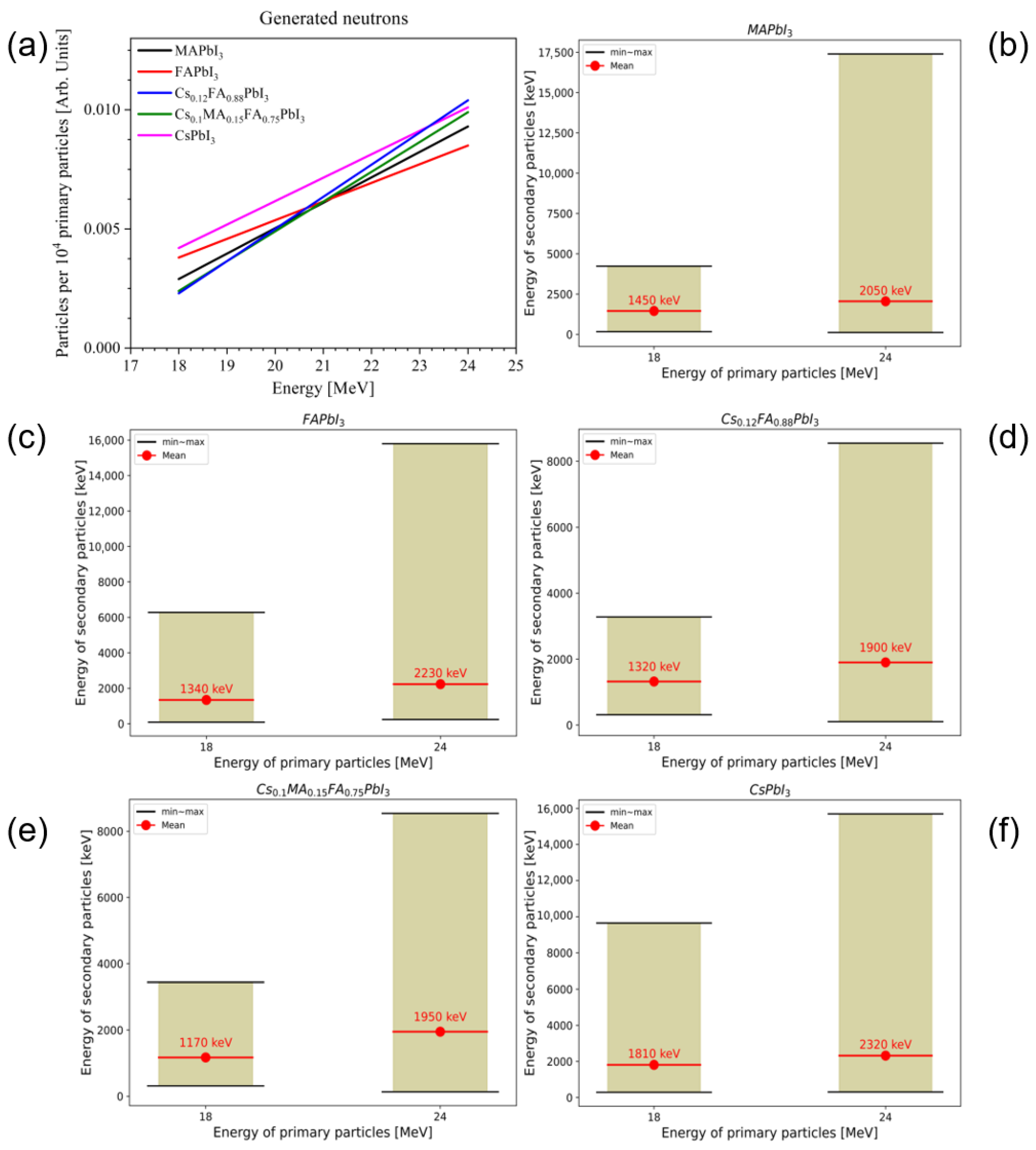 At 18 MeV, CsPbI3 exhibits the highest average energy of secondary neutrons. For MAPbI3 and mixed systems, the range between minimum and maximum energies is narrower compared to other perovskites. At 24 MeV, CsPbI3 again shows the highest average energy of secondary neutrons, while the mixed perovskites exhibit a smaller range between minimum and maximum energy values of secondary particles.