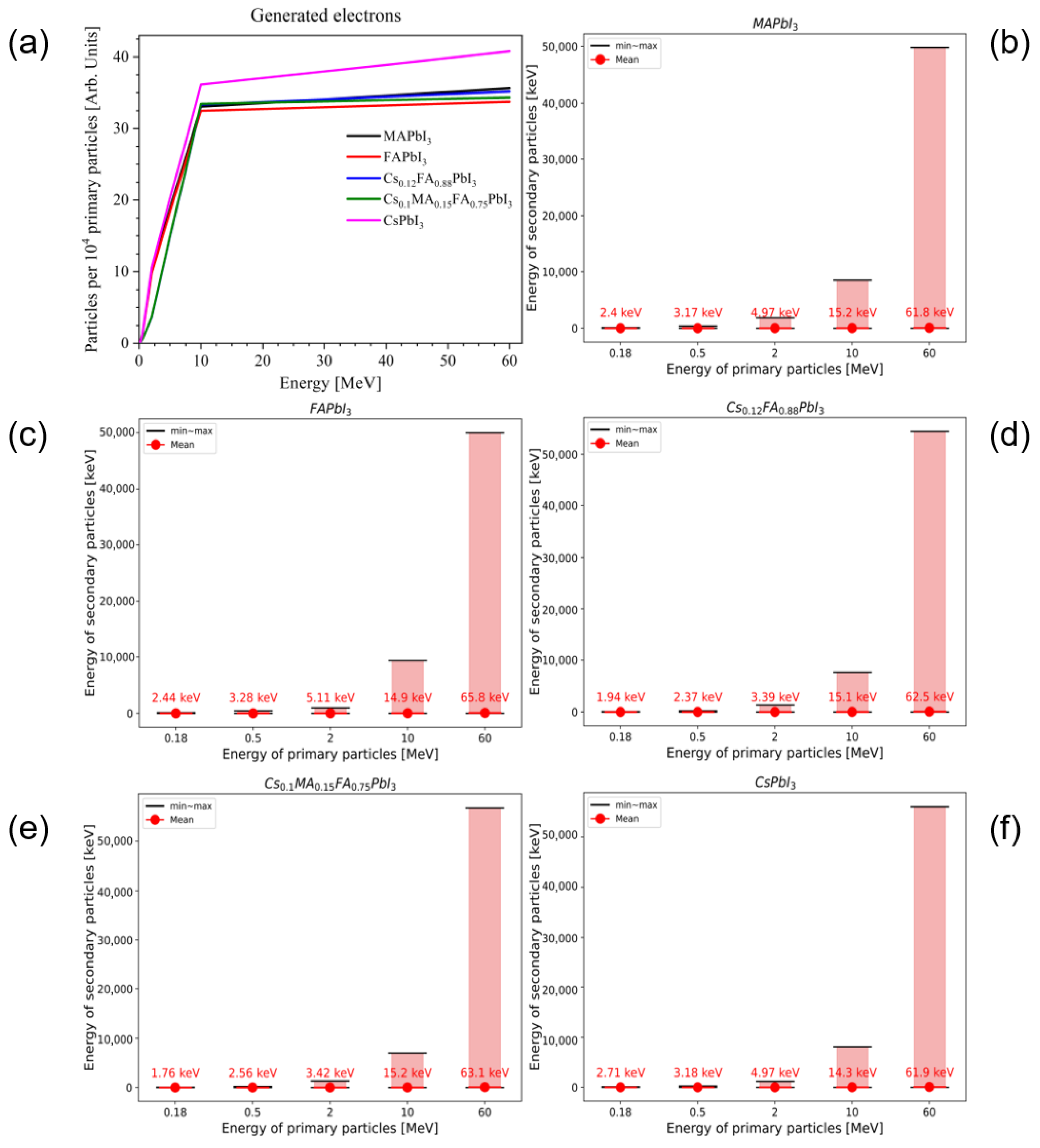 Secondary electrons generated under various types of radiation may participate in the radiolysis of the organic components in hybrid perovskites, such as methylammonium (MA) or formamidinium (FA) cations. Radiolysis involves the dissociation of chemical bonds due to ionizing radiation, potentially leading to the formation of volatile species, phase segregation, or defect accumulation in the organic-inorganic framework. For instance, low-energy secondary electrons can excite or ionize the organic molecules, promoting reactions like hydrogen abstraction or carbon-nitrogen bond cleavage, which compromise the structural integrity and optoelectronic properties of the material [25,56]. This effect has been observed in studies on X-ray-induced degradation, where secondary electrons contribute to lattice defects and instability in organic-inorganic halide perovskites [56]. While our simulations quantify the generation of such electrons, experimental validation is needed to assess their precise role in radiolysis processes.