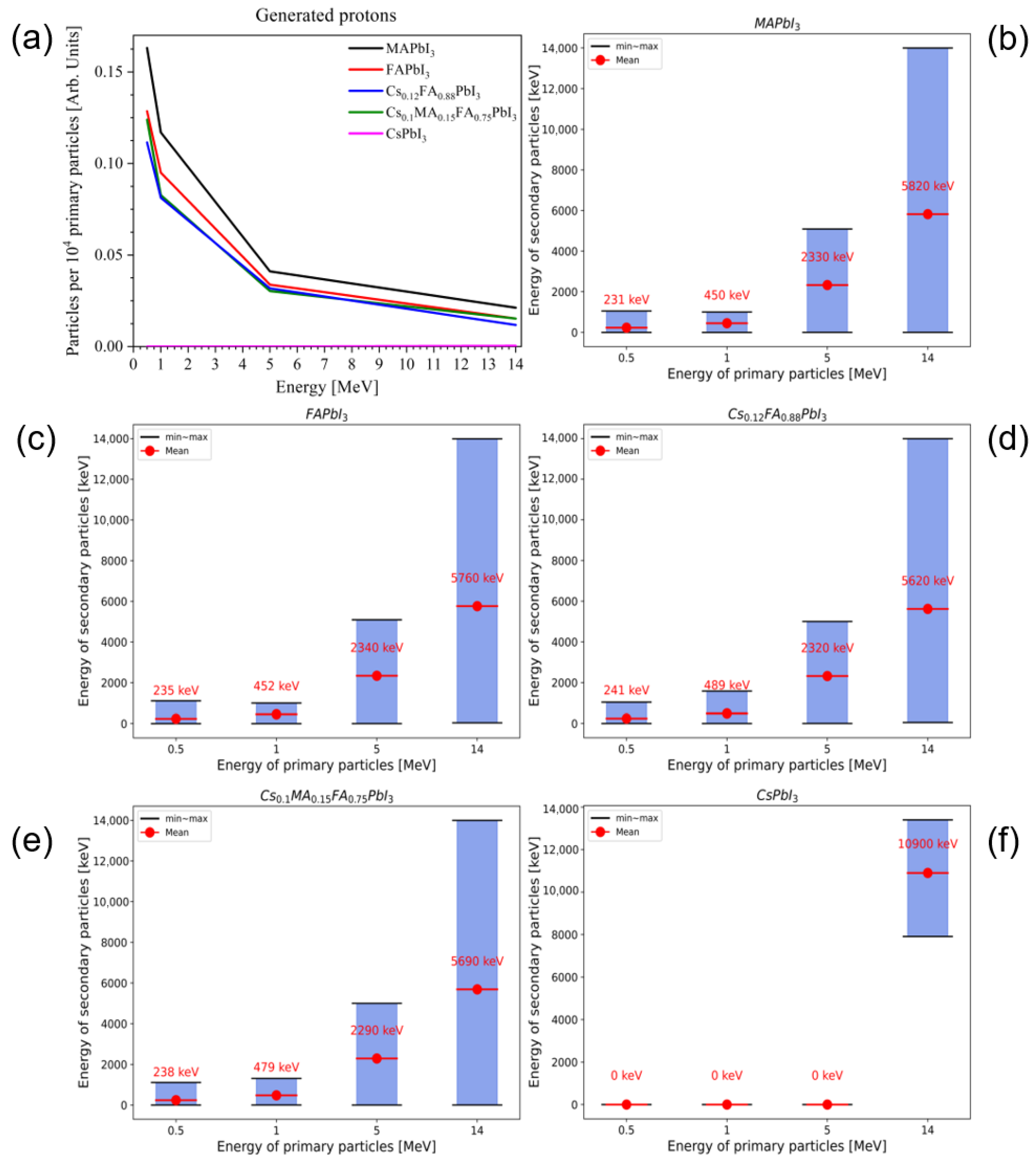 The energy distribution of secondary particles shows similar average values as for primary protons and ranges between minimum and maximum values across all systems. At higher energy levels (at 14 MeV), the range between minimum and maximum values is narrower for CsPbI3 compared to other perovskites.
