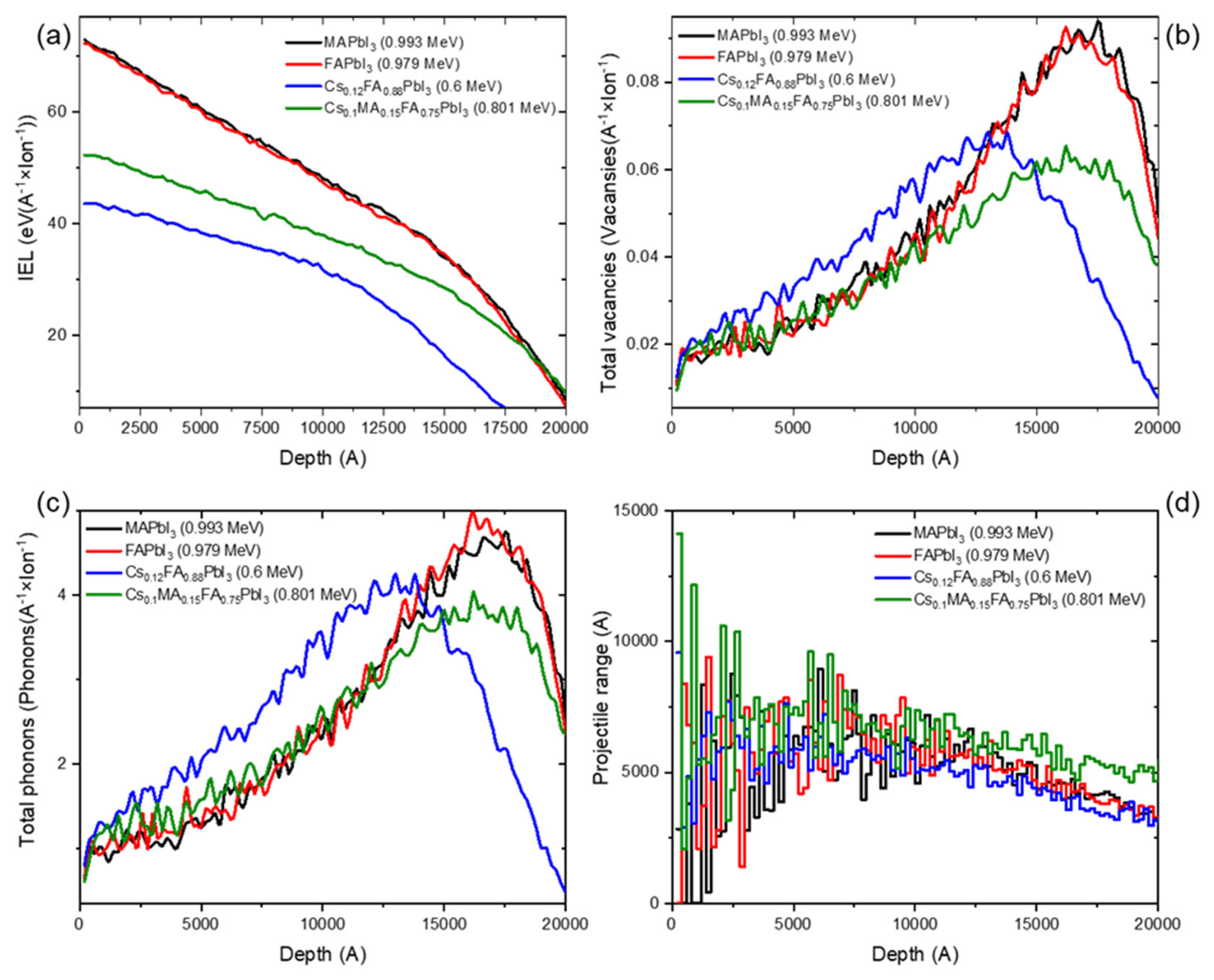 Figure 15. SRIM simulations of secondary 127I ions with perovskite materials: (a) ionizing energy loss, (b) number of produced vacancies, (c) number of generated phonons, (d) projectile range.