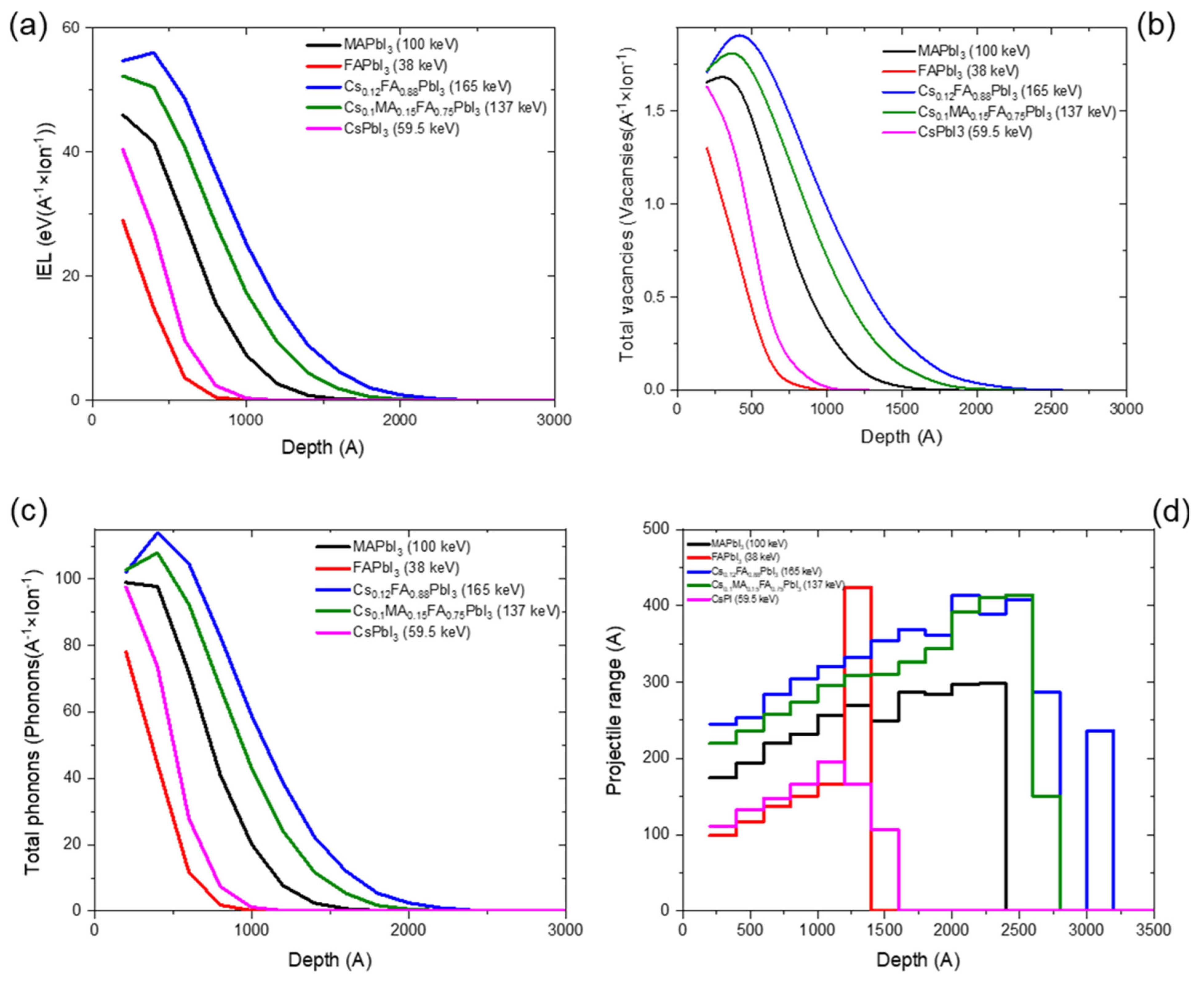 Our simulated secondary particle yields and energies align qualitatively with experimental observations of radiation-induced degradation in halide perovskites. For proton fluences above 1013 cm−2, studies report film darkening and reduced carrier lifetime, potentially linked to secondary electron cascades causing ionization, and defect clustering [29,53]. However, discrepancies arise in thin films, where surface effects and encapsulants alter secondary interactions, suggesting our bulk models provide a baseline for further experimental benchmarking.