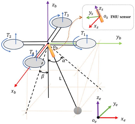 A UAV with a suspended-payload constitutes a highly coupled, underactuated, and nonlinear dynamic system, characterized by four control inputs and eight system outputs. If the payload is treated merely as an external disturbance, its swing during transportation can severely compromise flight safety. It is therefore essential to explicitly account for the coupling between the payload and the UAV by developing an integrated dynamic model of the suspended-load UAV system. A schematic diagram of the system is provided in Figure 1.