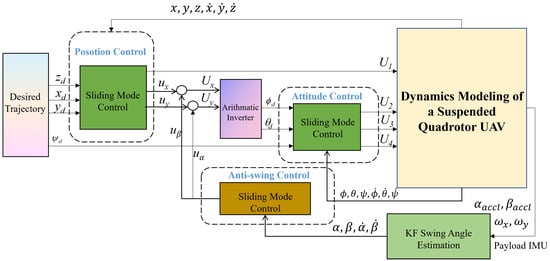As can be seen from Equation (15), the suspended-payload UAV can be divided into eight control channels. The control inputs for each channel are denoted as , , , , , , , . It is important to emphasize that the actual physical inputs to the system are , , , , while , represent virtual control inputs for position tracking, and , are virtual control inputs for swing angle suppression. These virtual control inputs must be converted into actual attitude commands to achieve their intended control objectives. Therefore, the control structure of the suspended-payload UAV can be organized into three parts: position control, anti-swing control, and attitude control.