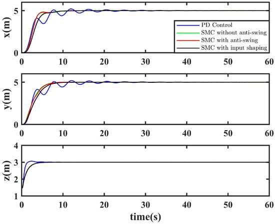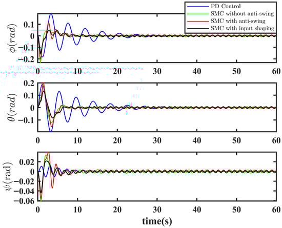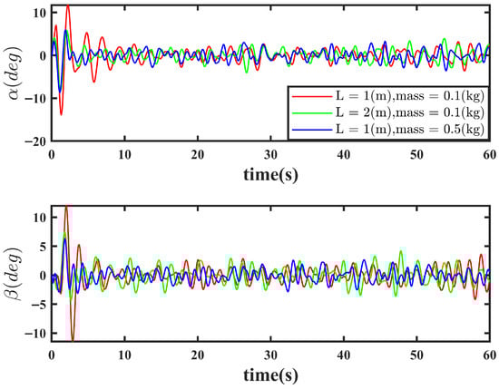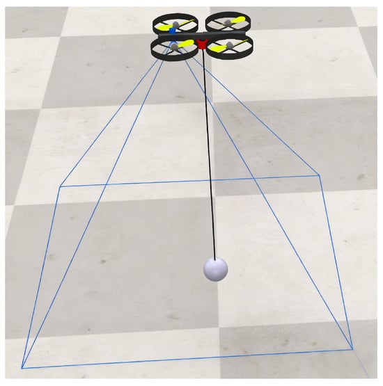 where denotes the generalized coordinates of the system and represents the generalized forces. Based on the assumption that the connecting cable is a rigid link, the force exerted by the UAV on the payload aligns with the direction of the cable. When the payload swings, the tension force of the cable remains perpendicular to the direction of the payload’s motion. As a result, the cable tension does no work and acts as a conservative force, which does not change the total energy of the system. By setting , and , , the equations of motion for the swing angles can be obtained [29]. Combining Equations (6) and (11) yields the dynamic model of a UAV with a suspended payload: