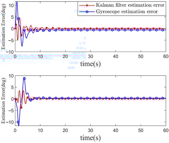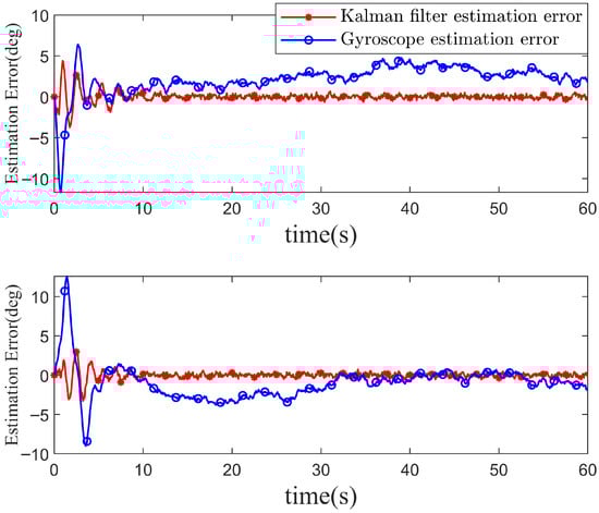 where represents the sampling time, which corresponds to the simulation step size in the simulation setup. The control input matrix maps external control inputs to state updates. In this study, the angular velocity measurements from the gyroscope are treated as external control inputs, directly driving the angular velocity states. The matrix is defined as: