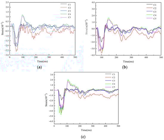 Experiment the strain curve under various impact velocities: (a) Strain curve of each channel at 34 m/s; (b) Strain curve of each channel at 36 m/s; (c) Strain curve of each channel at 38 m/s.
