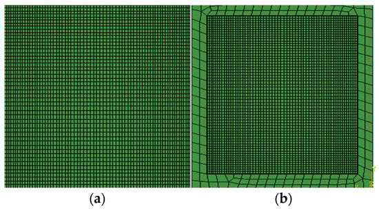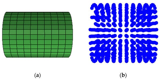 Figure 4a shows the simulation bird projectile model in ABAQUS (vrsion 6.13). The diameter of the bird’s body is 50 mm, and its height is 50 mm. This study utilized a gelatin bird projectile with a density of 1126 kg/m3. The properties of the simulated bird body match those of the bird projectile used in the experiment. The bird projectile is meshed, transforming the bird’s body into particles (SPH), as shown in Figure 4b. This study used a 5 mm bird projectile grid size because it is not an analysis object. The study used 960 grids for the bird projectile, with 1243 nodes. The bird projectile is assigned a velocity through predefined fields, as shown in Figure 5, and then assembled with the composite laminate.