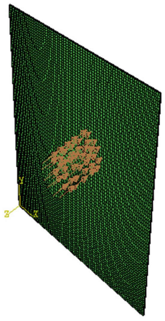 A solid model of a carbon fiber composite laminate was developed, measuring 300 × 300 mm, with the material divided into eight layers. The material orientation is assigned in the properties. A finite-thickness cohesive model between layers was developed to simulate the interlayer composite material properties. The composite laminate was meshed with a 3 mm grid size, as shown in Figure 6a. The laminate consists of 47,432 C3D8R elements and 41,503 COH3D8 elements, totaling 97,344 nodes. The boundary of the composite material was constrained by applying boundary conditions. Figure 7 shows that the four sides of the composite laminate are fully constrained. A rigid frame is added to the back of the composite laminate to constrain the composite laminate, as shown in Figure 6b. Finally, it is assembled with the bird’s body.