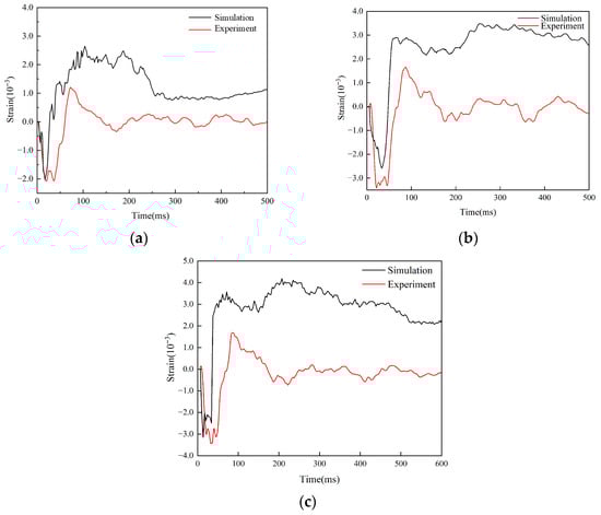 Comparison of experimental and simulated strains of 3 groups at various speeds: (a) test and simulation strains at 34 m/s; (b) test and simulation strains at 36 m/s; (c) test and simulation strains at 38 m/s.