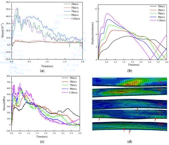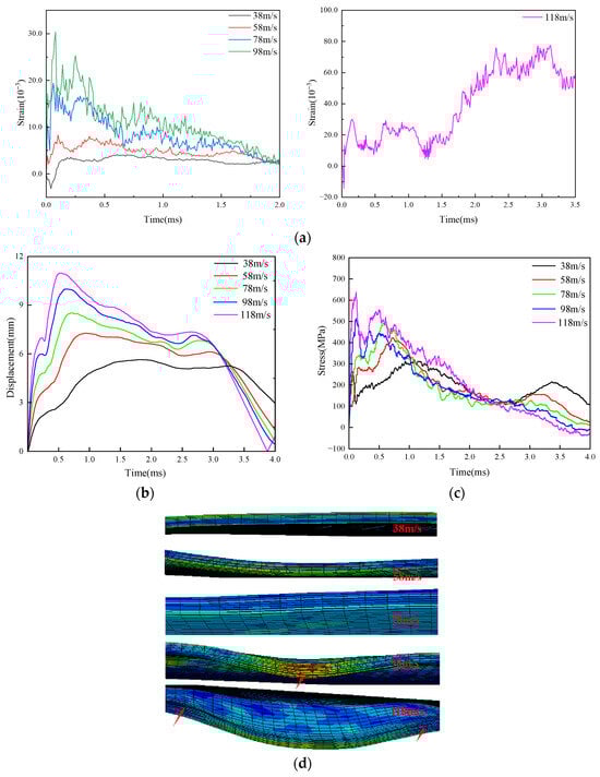 Figure 10 shows the changes in strain, displacement, and stress under the L2[45/0/45/0]2S scheme. The strain mutation speed of L2 paving is 58 m/s, and its strain reaches 3.90% (Figure 10a), stress 309.88 MPa (Figure 10c), and displacement is 8.30 mm (Figure 10b). Comparing with Figure 9, it is evident that the displacement is 1.06 mm greater than that of the L1 layer, and the L2 layer’s strain at 58 m/s is four times that of the L1 layer. Figure 10d’s impact form indicates no discernible delamination at 58 m/s. However, at 78 m/s, 98 m/s, and 118 m/s, delamination failure is apparent, and the corresponding stresses are 398.60 MPa, 527.01 MPa, and 619.40 MPa (Figure 10c), respectively. At 78 m/s, failure of the L2 layer initiates. The strain was distributed between 4% and 5.5% (Figure 10a).
