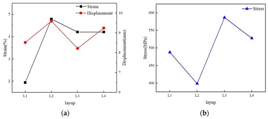 The strain, displacement, and stress curves of L4 layering: (a) Strain; (b) Displacement; (c) Stress; (d) The morphology of L4 laminates.
