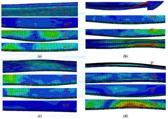 At various impact angles of 0°, 22.5°, 45°, and 67.5°, the morphology of L1[45/−45/45/−45]2S, L2[45/0/45/0]2S, L3[45/0/−45/90]2S and L4[0/90/0/90]2S pavement impacting the carbon fiber laminates, as shown in Figure 15. After simulating the layers struck at several speeds, it was found that nearly all layers were unable to stratify at 78 m/s when hit by a 115 g bird. Figure 15a shows the impact morphology at all angles, indicating no obvious delamination failure or fiber fracture at all angles. This also implies that L1 layering failure is not significantly related to the impact angle. Delamination failure in the L2 layer occurs at 0° impact when compared with the impact morphology of Figure 15b. However, at 22.5°, 45°, and 67.5° angles, the impact delamination failure disappears, suggesting that the impact damage of carbon fiber composite impact laminates is minimized at these angles. It also demonstrates how the angle of the birdshot and composite laminates affects the extent of impact damage. Compared with the impact morphology shown in Figure 15c, it is evident that the four sets of angles under the L3 paving layer do not cause any visible delamination failure or other failure modes. As shown in Figure 15d, the layer and plate of the L4 layering have the lowest impact resistance. It is the only group that experiences delamination failure under the impact of a bird at 22.5°. No delamination failure occurred in the four groups at 22.5° (Figure 15) when compared with the three other groups.