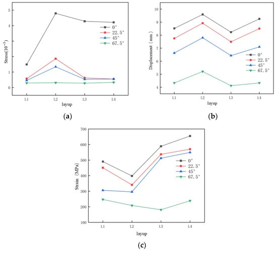 Comparison of impact data of four groups of layering at various angles: (a) Strain; (b) Displacement; (c) Stress.