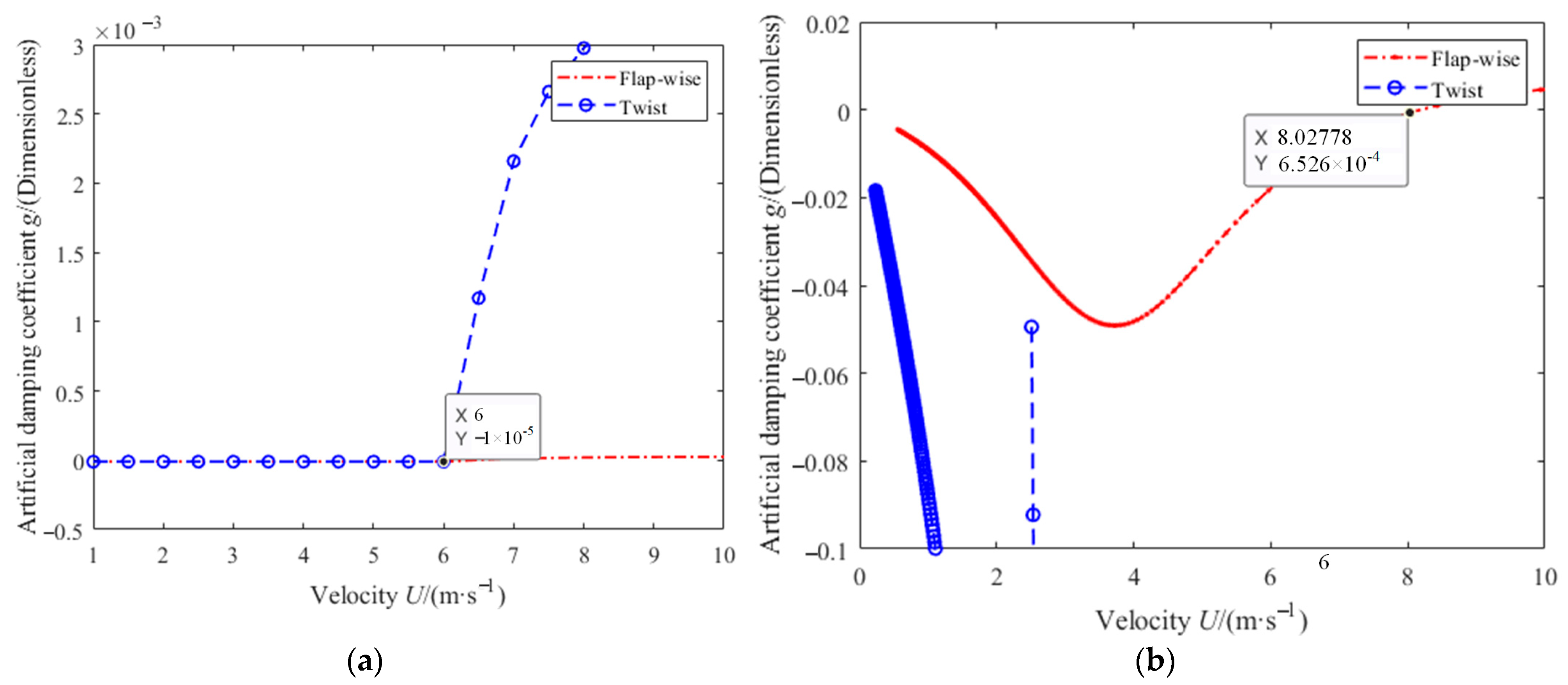 Figure 13, it can be seen that in both cross-sectional cases, the first four frequencies of the aeroelastic rigid body system are first-order flapping, second-order flapping, third-order flapping, and first-order twist, reflecting the structure of flapping as the main mode. This is completely consistent with the main mode effect generated by adding the NTVA in