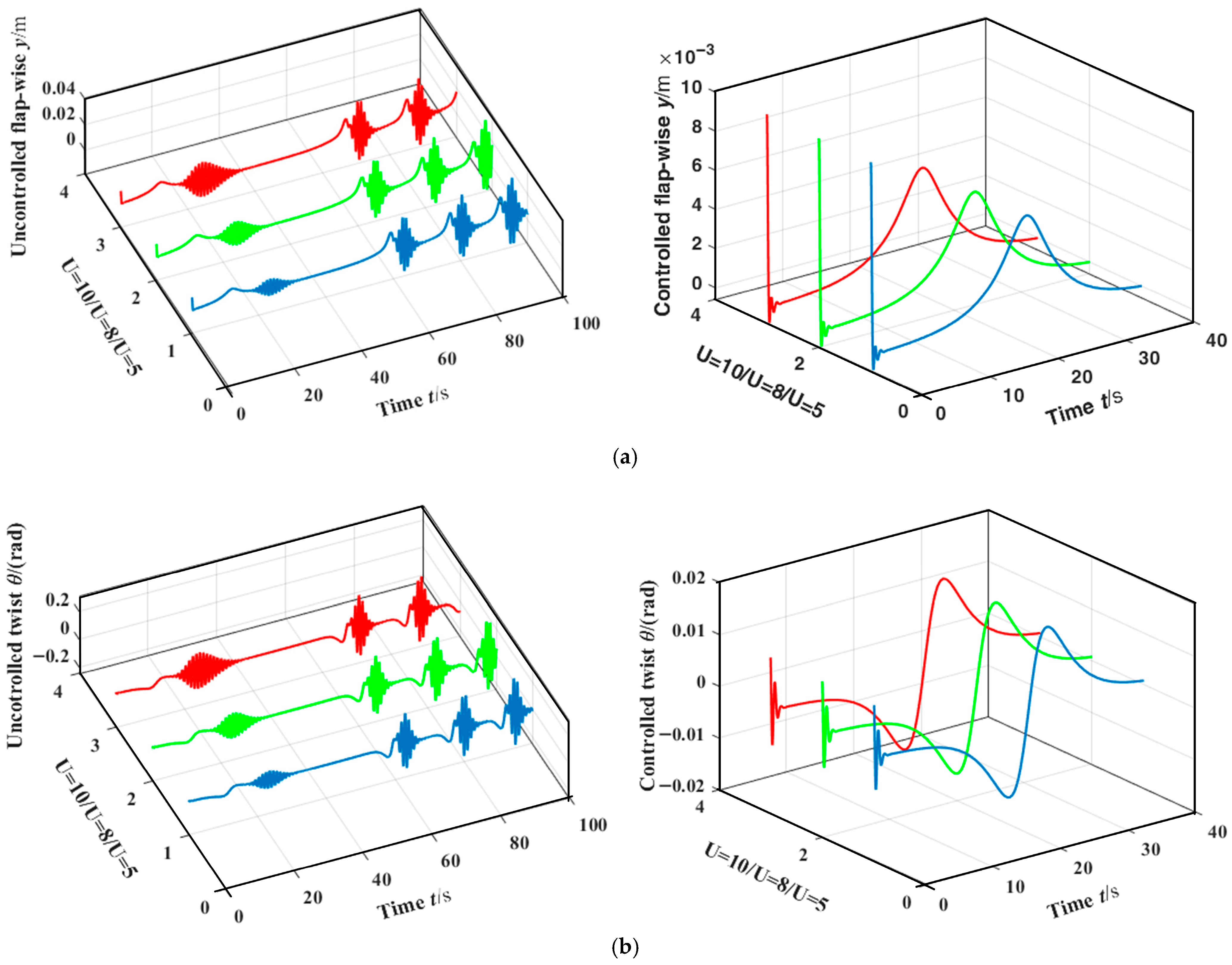 Figure 7 only shows the comparison of the controlled flapping/twist displacement within [0 40] seconds. At the same time, the controlled amplitude and frequency decrease rapidly, and the trend of time-domain changes is basically consistent. The robustness of the control algorithm is also verified.