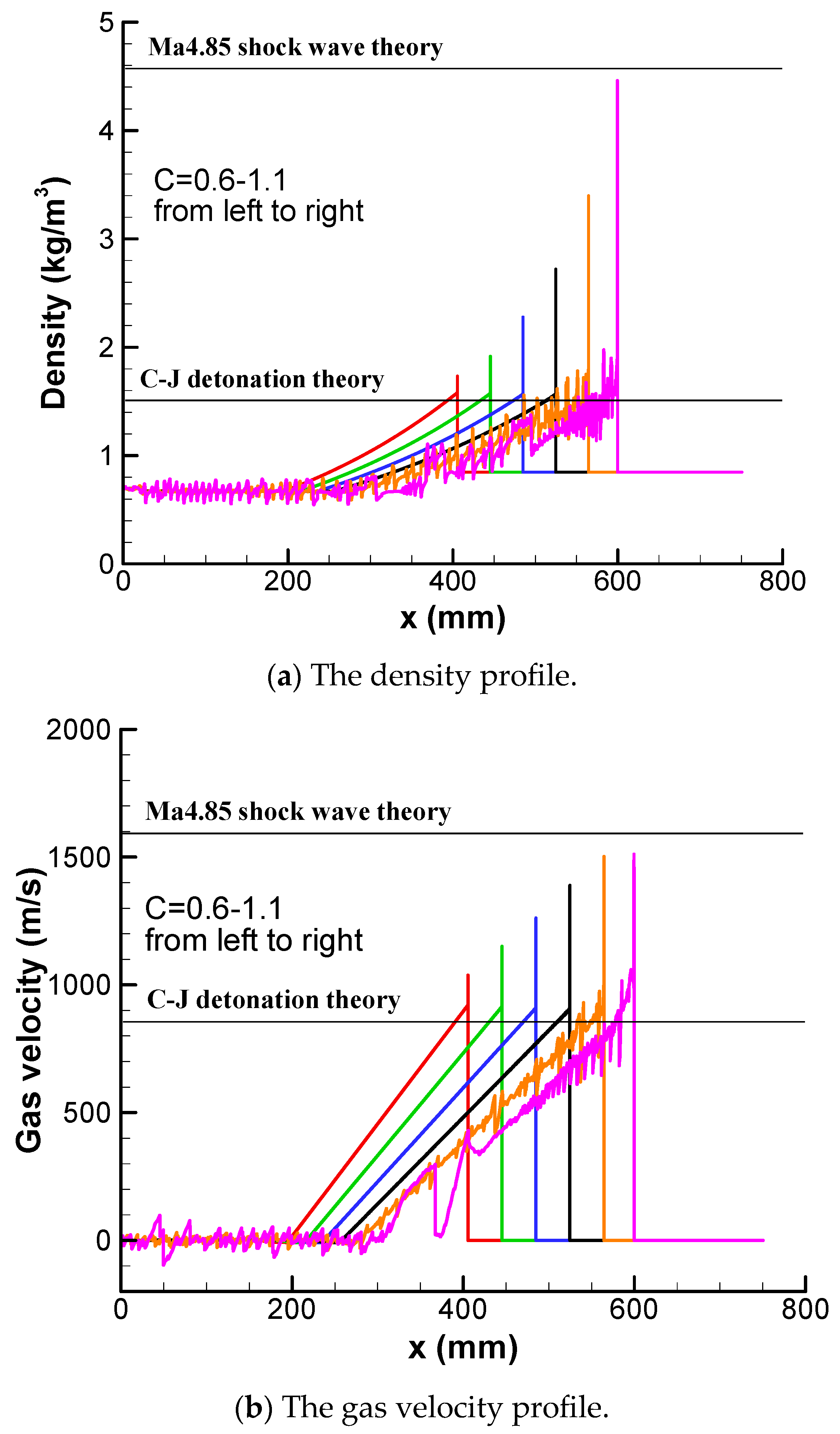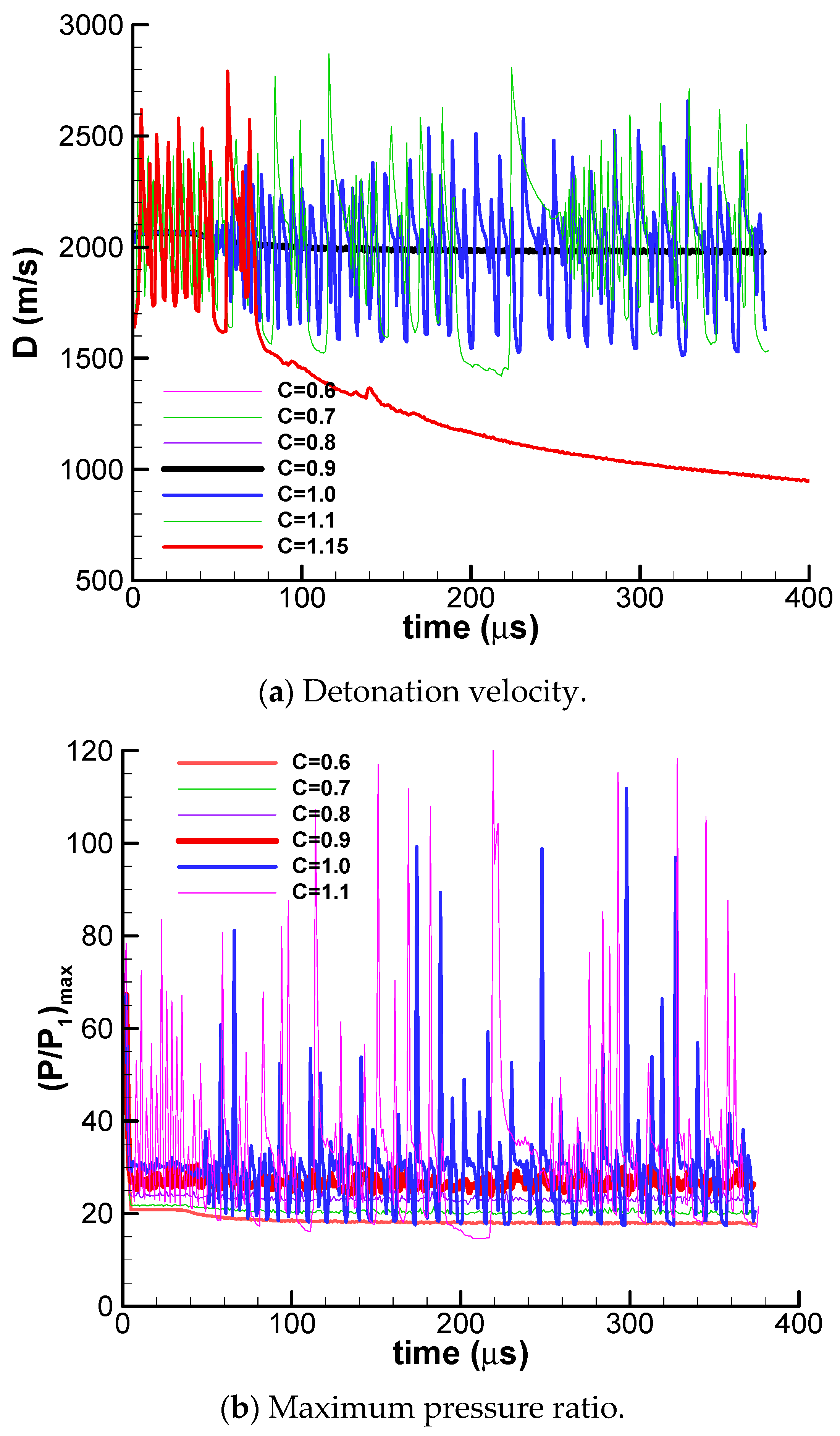 The detonation velocity and the maximum pressure ratio are plotted in Figure 1. Figure 1a shows the detonation propagation velocity with different values from C = 0.6 to 1.15. If the activation energy is lower than C = 0.5, premature combustion of reactants will occur. The detonation propagation mode can be categorized into three regions roughly based on velocity: a stable region (C = 0.6–0.9), an unstable region (C = 1.0–1.1), and a quenching region (C ≥ 1.15). In the stable region, the average detonation velocity matches the theoretical C-J detonation velocity (1950 m/s) for a stoichiometric H2–air mixture. The detonation velocity in the unstable region oscillates very violently between 1400 m/s and 2850 m/s, or between 0.71 DC-J and 1.46 DC-J. The detonation is quenched abruptly to a deflagration wave when the value of parameter C is larger than 1.15.