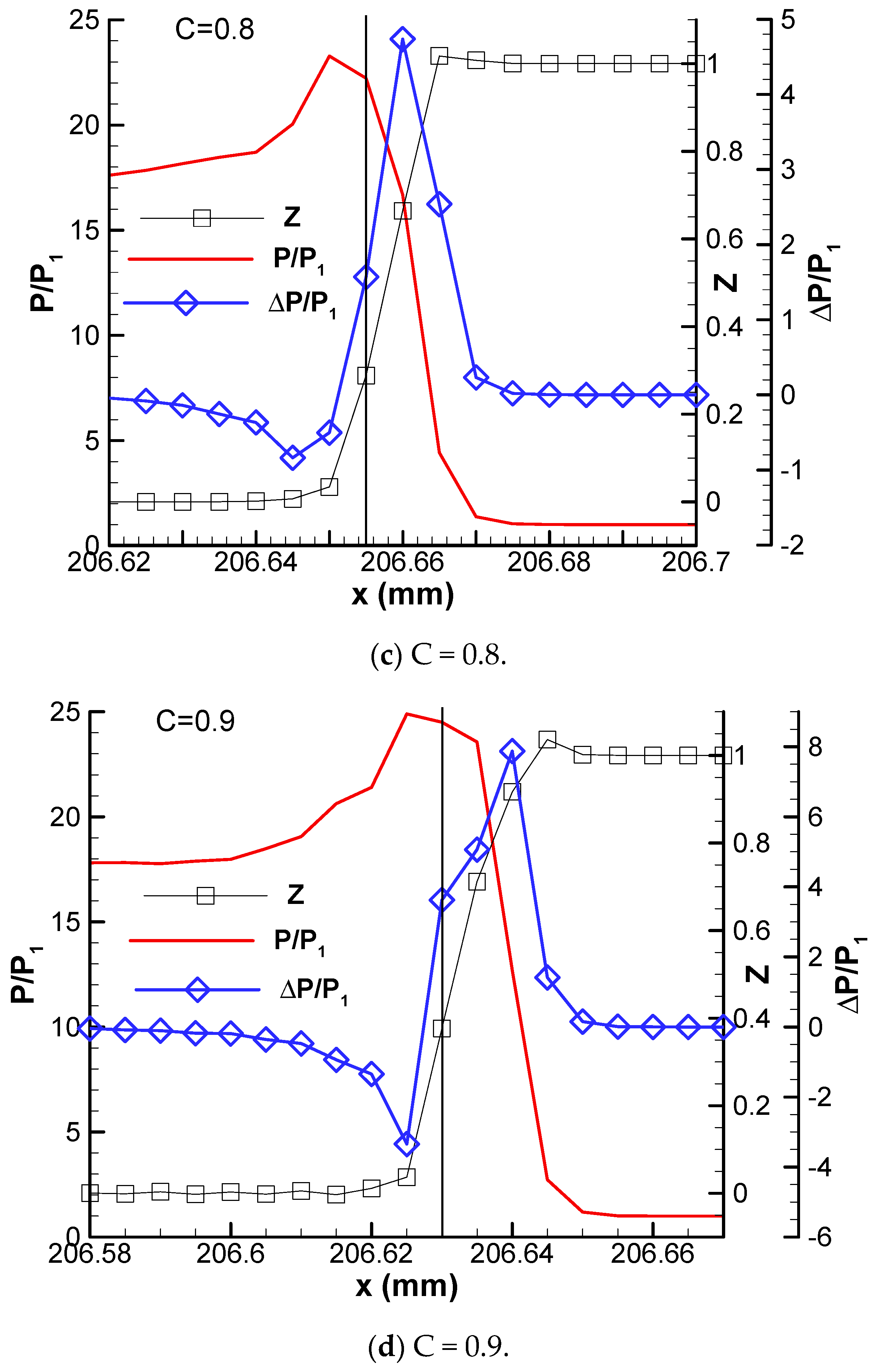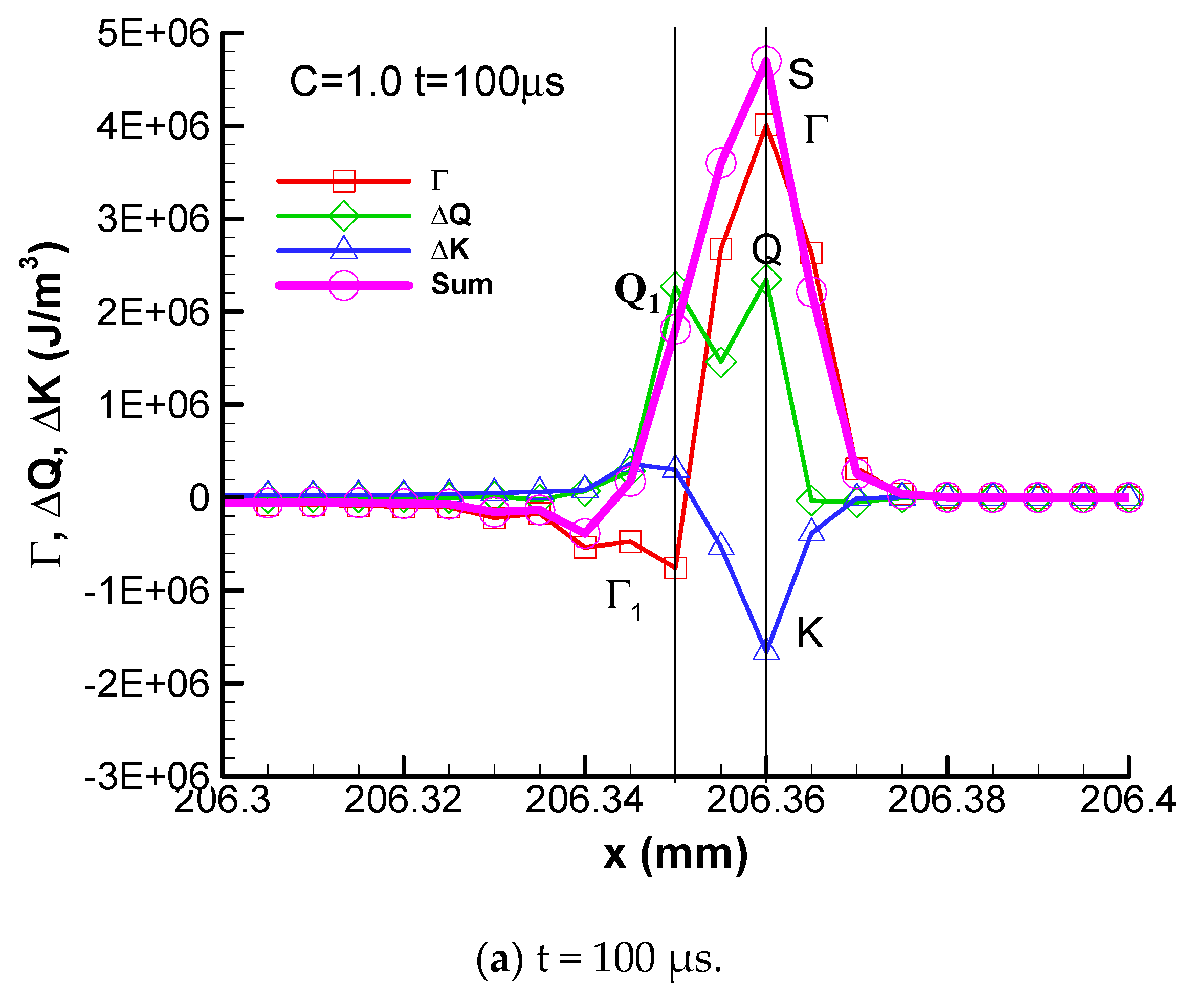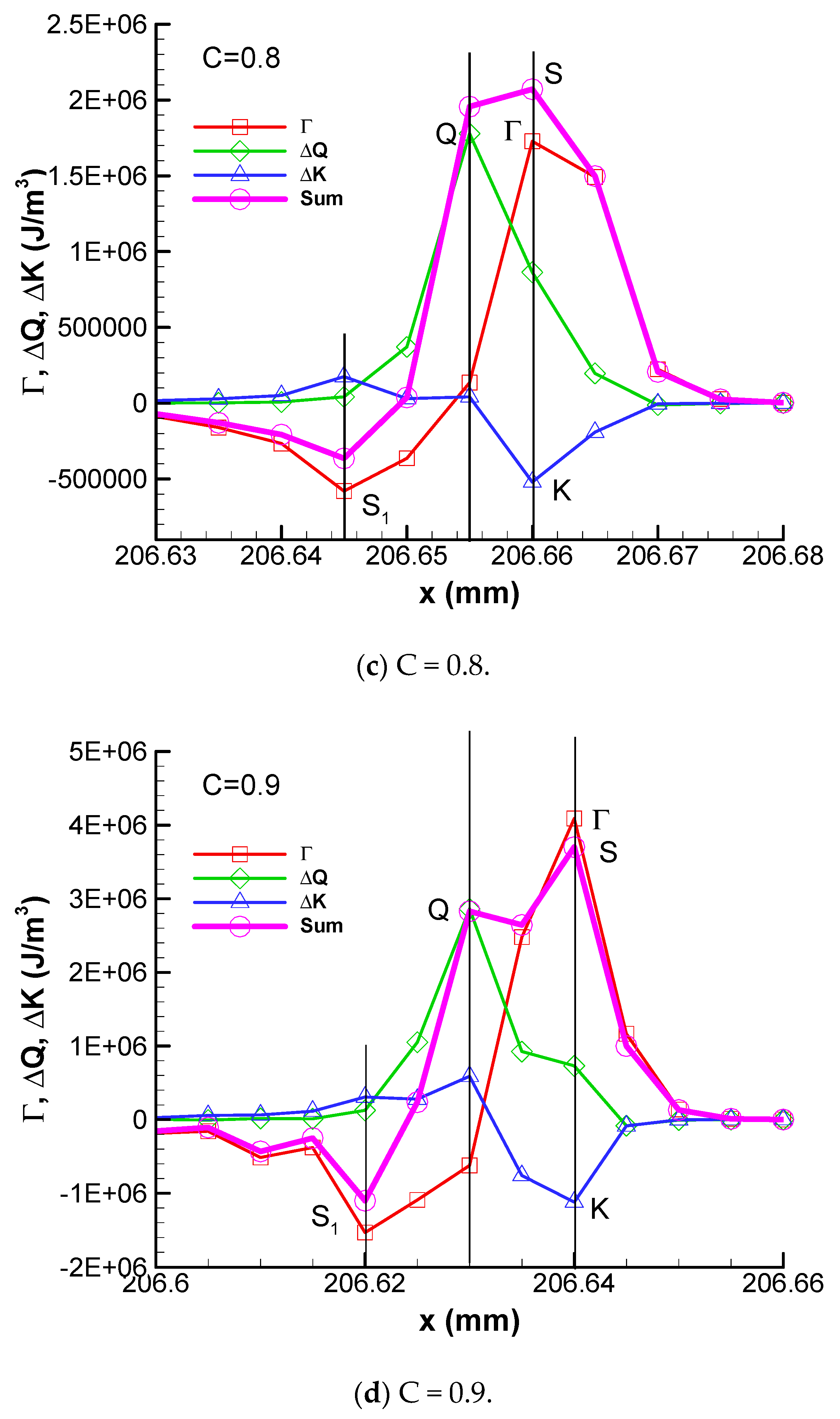 It can be seen that, for C = 0.6, these four peaks are at the same grid point. The heat release is tightly coupled with the shock wave. The kinetic energy ΔK is negative and its absolute value is smaller. The algebra summation of these three fluxes is positive. With the increase in activation energy, for C = 0.7, point Γ and point K are at the same grid point of x = 206.67 mm, but the absolute value of K becomes stronger. The heat release summit point Q and the summation peak S are at x = 206.665 mm, which is one grid point behind the summit point Γ of convective flux. In addition, a negative convective flux peak point S1 begins to appear, which is a rarefaction wave (S1≈ −0.2 MJ/m3), and reduces the internal energy per unit volume of detonation products.