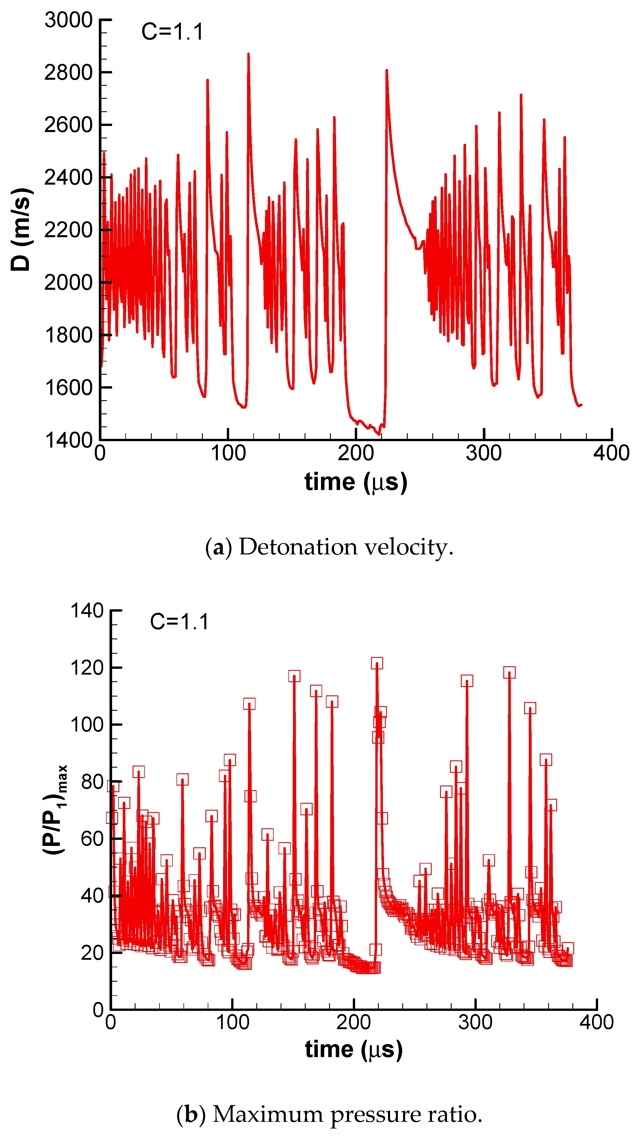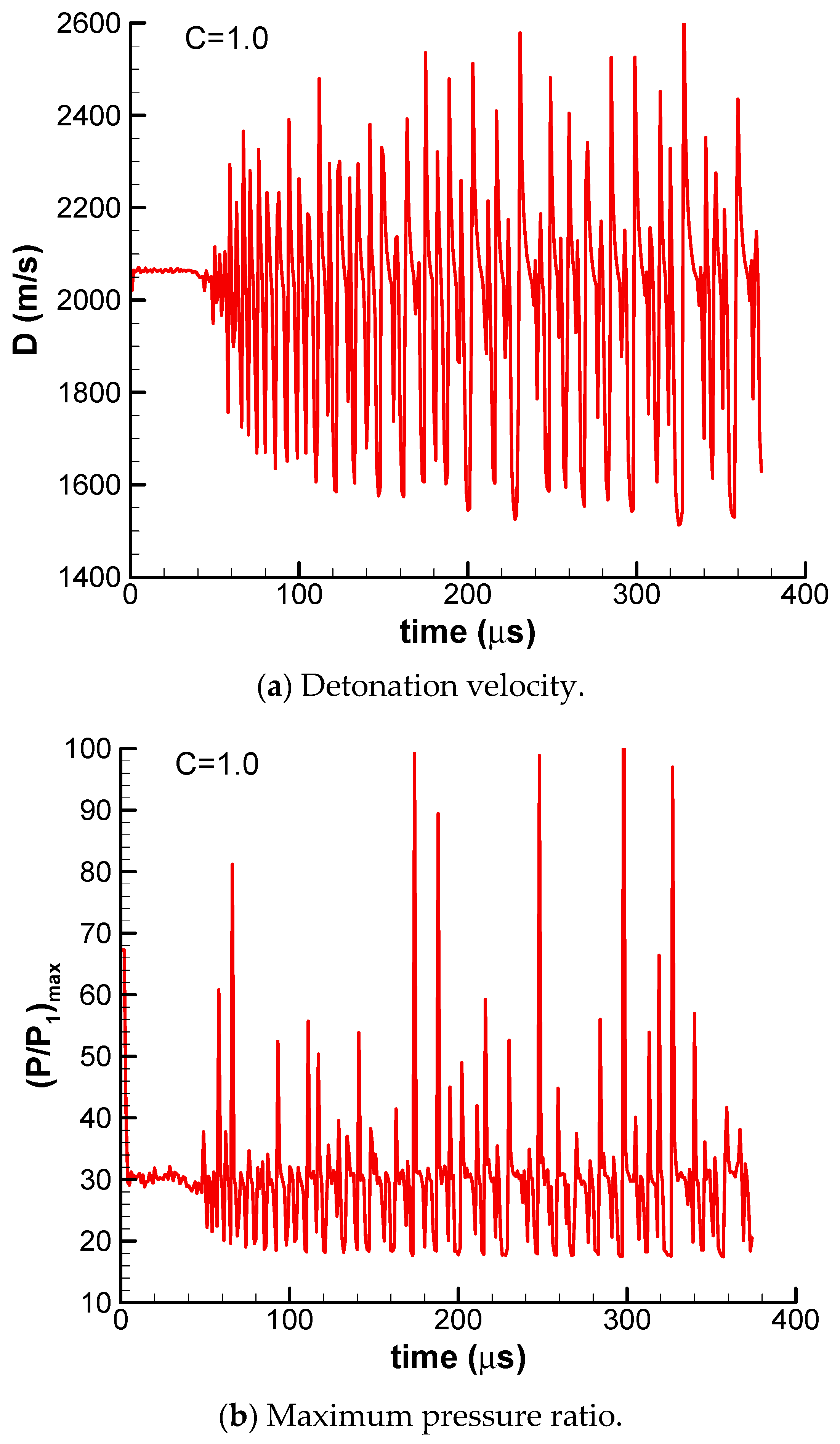 The detonation velocity and maximum pressure ratio of pulsating detonation (C = 1.1) are shown in Figure 10. It can be found that the detonation shows pulsating behavior or chaotic behavior under higher activation energy. The detonation velocity oscillates very violently between 1400 m/s and 2900 m/s, and the maximum pressure ratio oscillates very violently between 15 and 120. Additionally, it looks like the detonation is quenched at about t = 210 μs and the reignition occurs at about t = 220 μs.