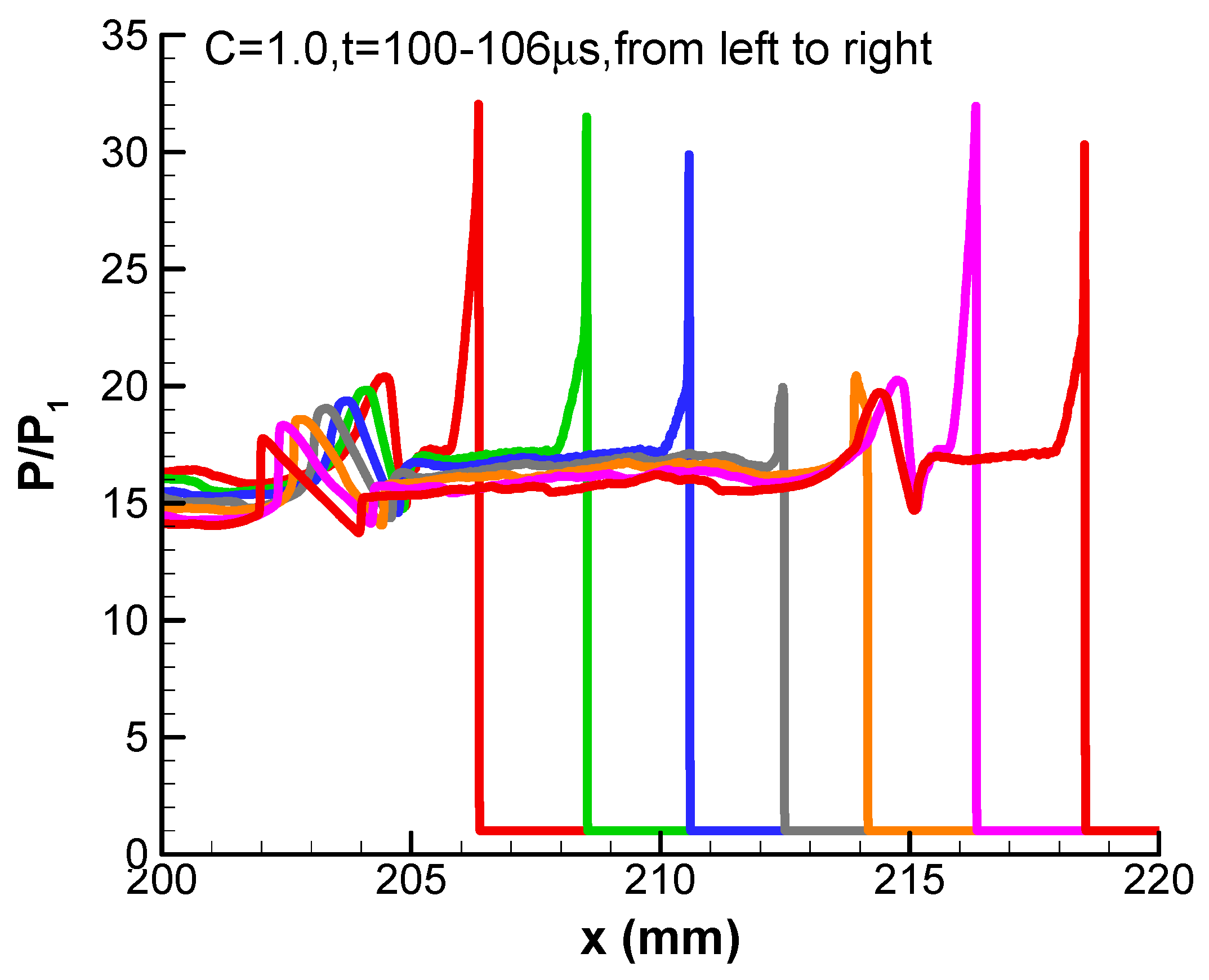 The detonation wave becomes periodically unstable when the activation energy increases to C = 1.0. The detonation velocity and maximum pressure ratio of the periodic detonation are plotted in Figure 4. It looks like the detonation has the regular and periodic oscillation behavior. The enlarged local pressure profiles from 100 μs to 106 μs are plotted in Figure 5. It can be seen from Figure 5 that the detonation wave is quenched at t = 103 μs and 104 μs, but is reignited at t = 105 μs.