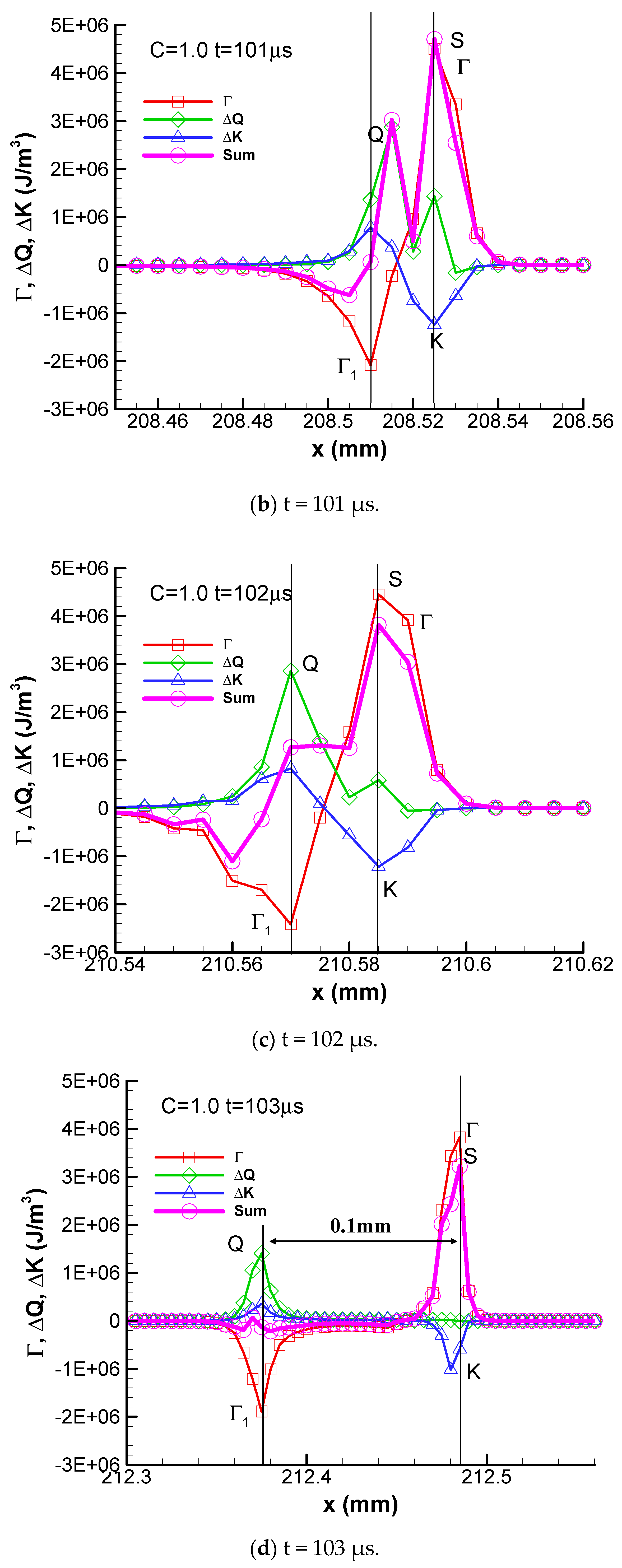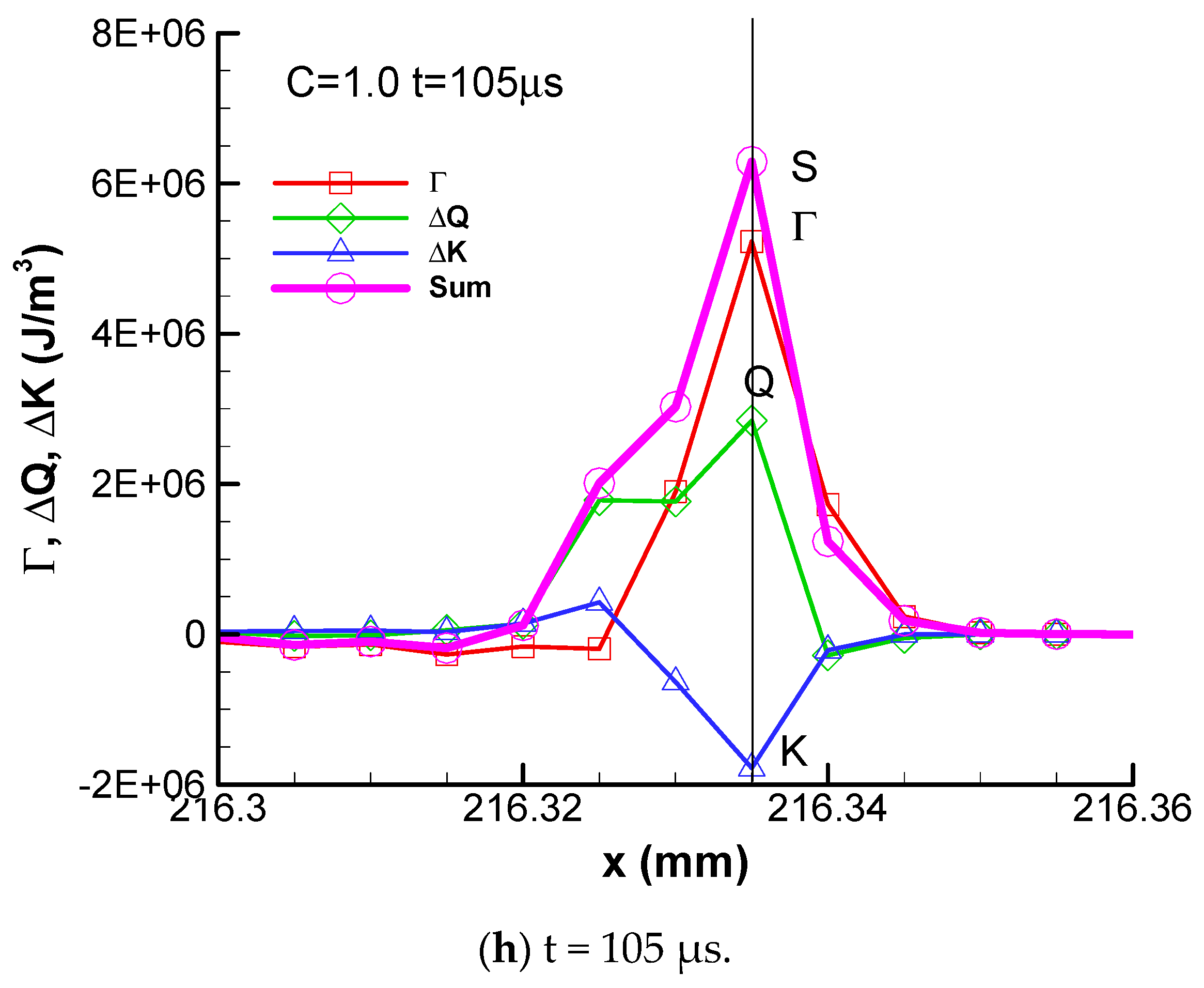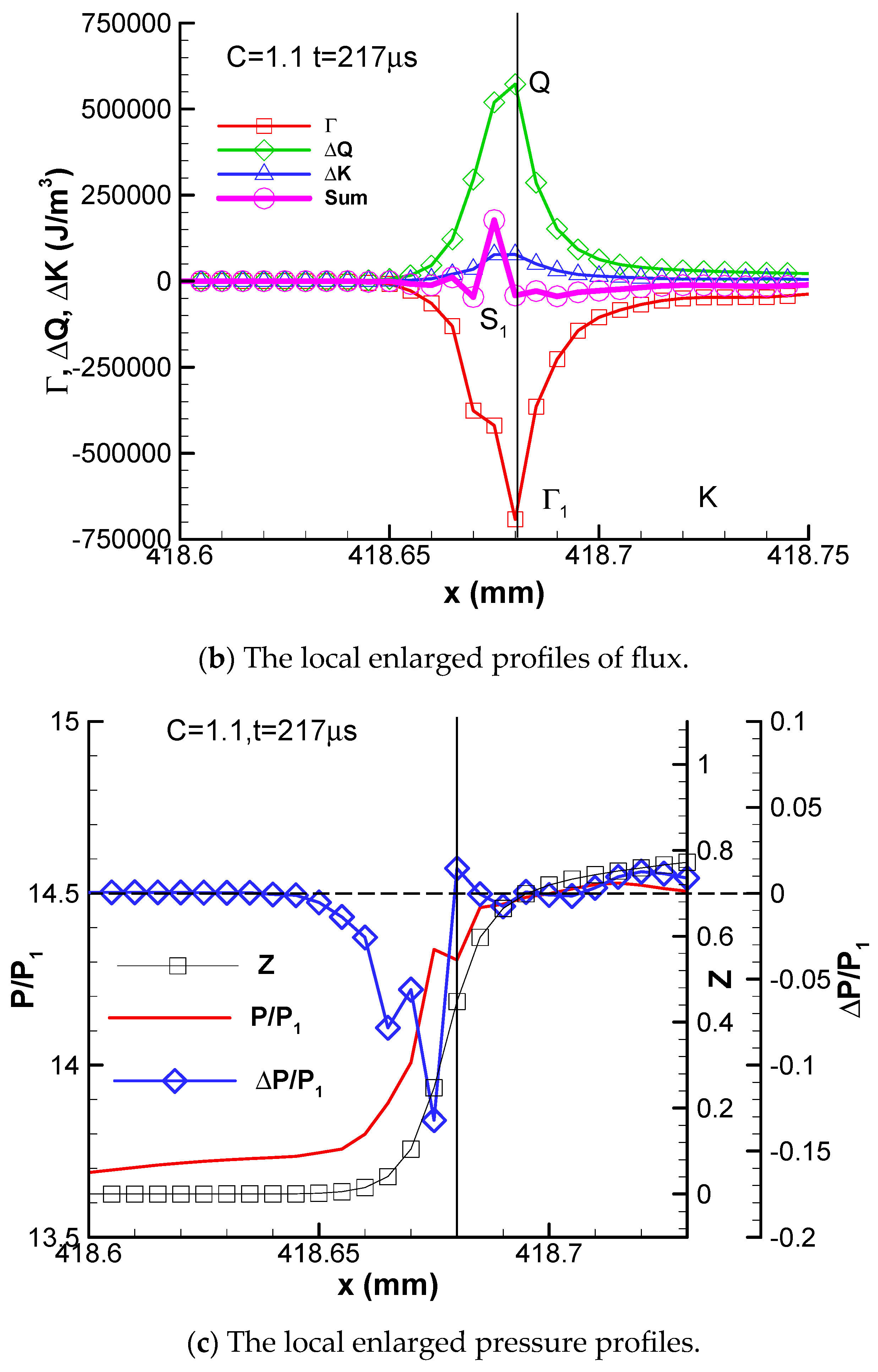 The profiles of convective flux Γ, kinetic energy ΔK, heat release ΔQ, and the algebra summation of these three fluxes of stable detonation are plotted in Figure 2. In the following discussion, for convenience, the summits of heat release and convective flux are labeled as Q and Γ, the bottom of the kinetic energy valley is labeled as K, and the peak of the algebra summation of these three fluxes is labeled as S in the figures, respectively.