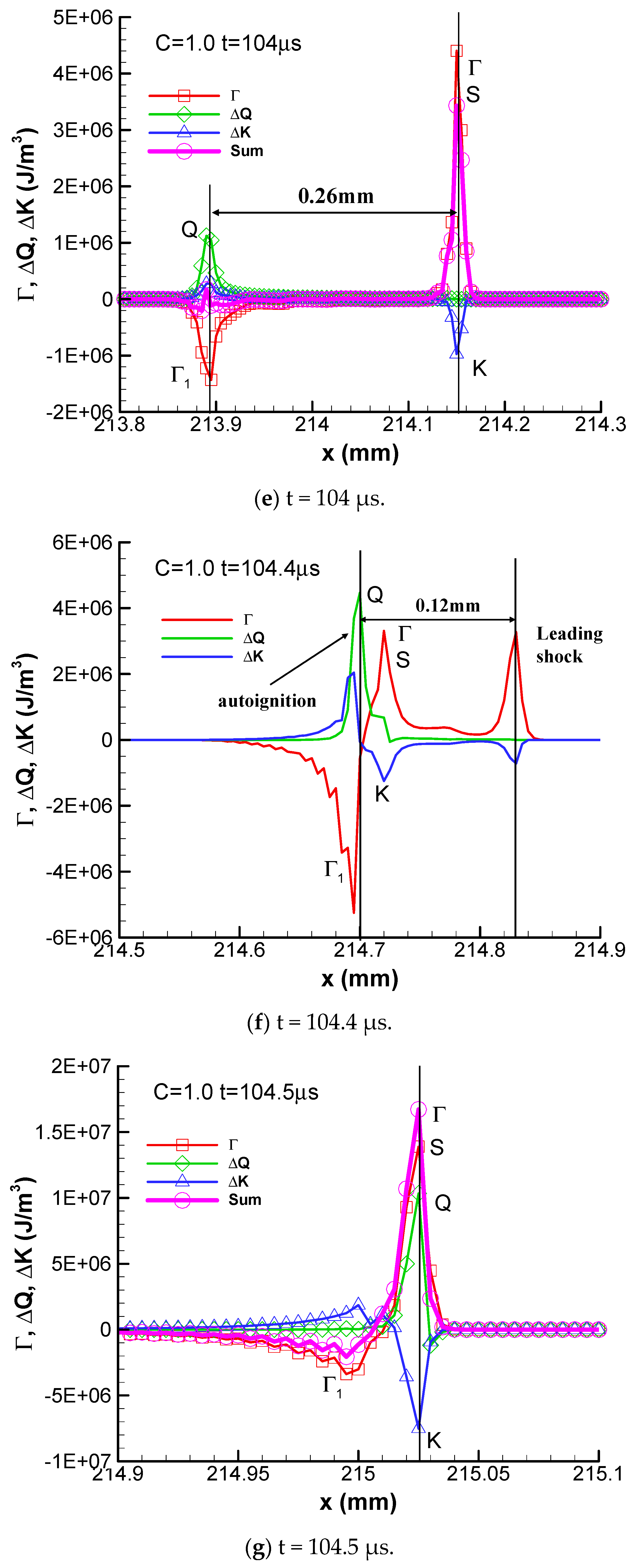 At t= 101 μs, the point Q is two grid points behind the shock wave. The negative convective flux point Γ1 becomes stronger and is only one grid point behind the heat peak point Q. At t= 102 μs, the negative convective flux point Γ1 moves forward and is at the same grid point with the point Q at x = 210.57 mm. The total summation of these three fluxes is very small, which means that the internal energy of combustion products does not increase too much, although combustion takes place there. At t = 103 μs and 104 μs, the flame fully decouples from the shock wave. The flame coincides with the negative convective flux and the summation is almost zero. The combustion becomes constant-pressure combustion in a sense at these two instants. The distance between the flame and the shock wave becomes wider as time goes by. However, autoignition occurs at t = 104.4 μs and the flame is recoupled with the shock wave again at t = 104.5 μs. The detonation wave propagates periodically following this mechanism.