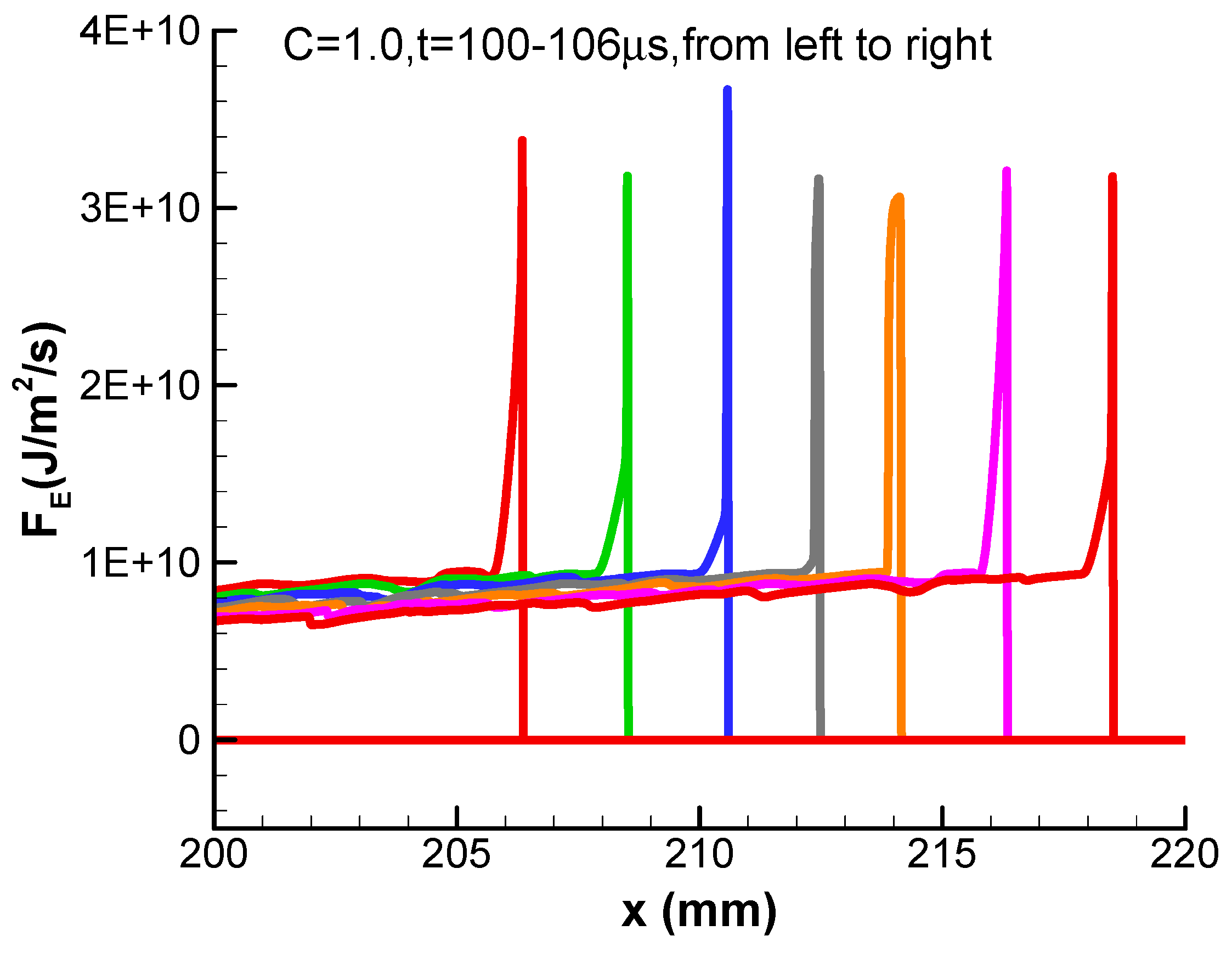The above discussion indicates that the negative convective flux plays a crucial role in detonation instability. This negative convective flux is generated by the sharper and steeper enthalpy flux FE at the detonation front, which is defined in Equation (12). The corresponding enthalpy fluxes of the periodic detonation at different instants are shown Figure 7. We can see from Figure 7 that the gradient of enthalpy flux at detonation front is very large.