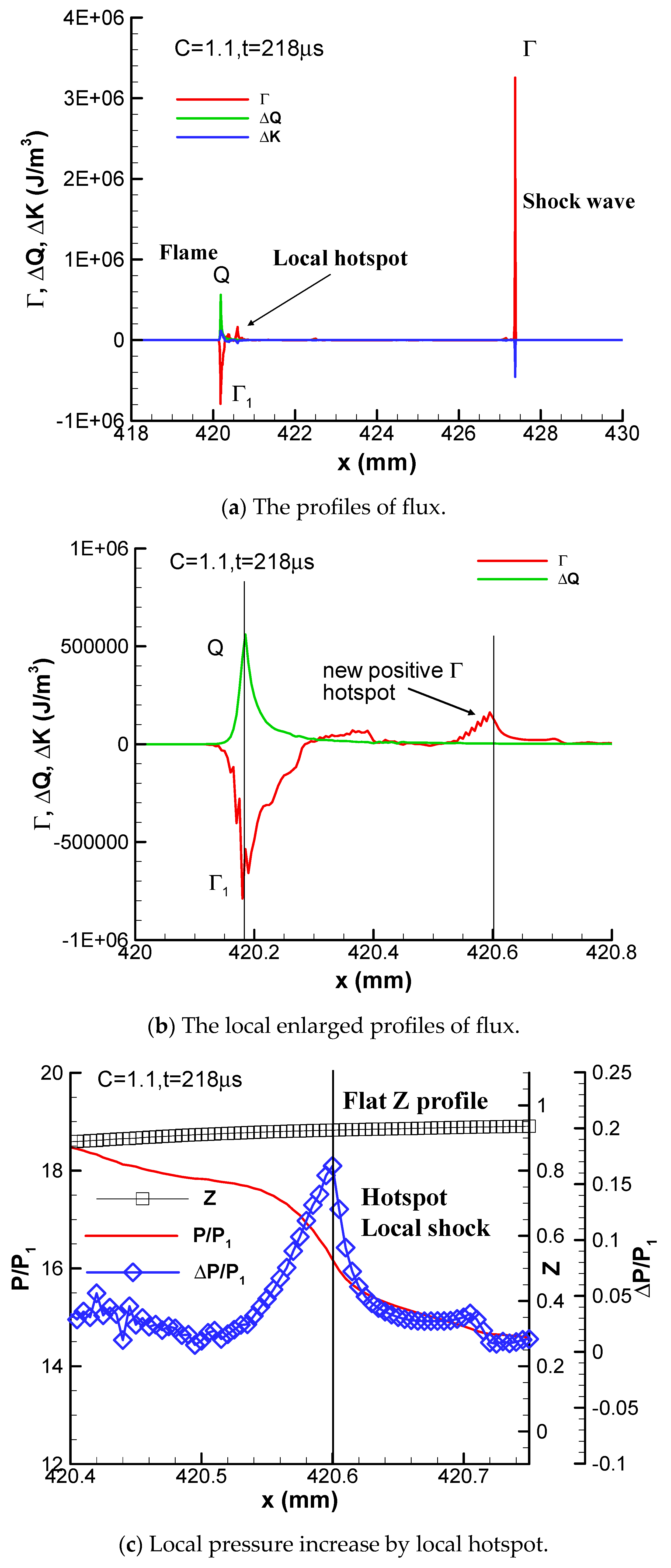 The profiles of flux at t = 218 μs are plotted in Figure 12. The flame is still decoupled from the shock wave at this instant. However, a new positive convective flux or a hotspot emerges in front of the flame at x = 420.6 mm, which is shown clearly in Figure 12b. This local hotspot increases the total energy per unit volume due to compression waves, rather than combustion heat release. No heat is released at this hotspot at this instant because the Z profile is flat there. As a result, the local pressure and temperature are increased by this compression wave, as shown in Figure 12c. Figure 12c reveals that the compression wave generates a positive pressure gain of about 0.16 atm at x = 420.6 mm. Autoignition induced by this hotspot occurs at the next time step.