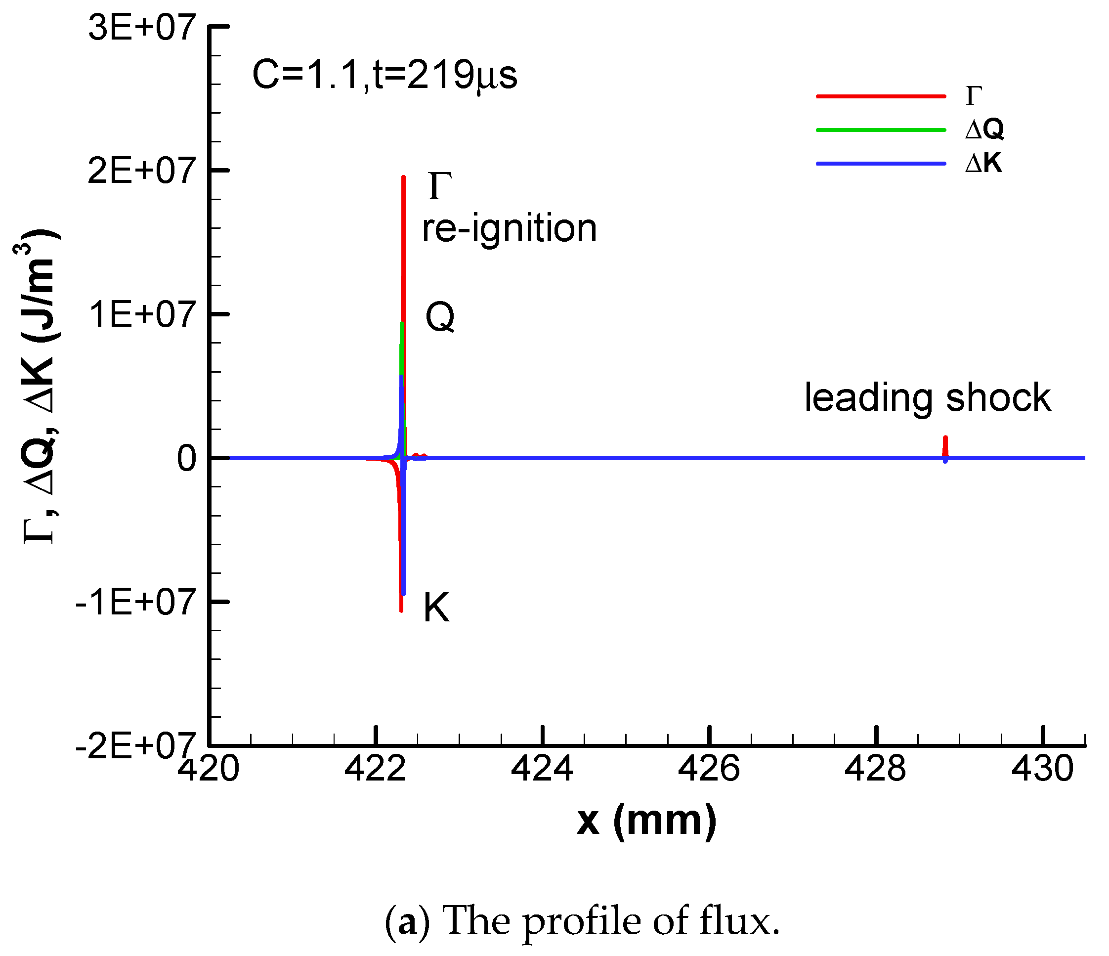 According to Equations (8)–(11), the pressure gain Δp at one time step is determined by three terms: the convective flux, the kinetic energy term and the heat release term. To facilitate numerical analysis, we define the convective flux (Γ), the enthalpy flux (FE), the kinetic energy term (ΔK), and the chemical reaction heat release flux (ΔQ) at each time step. In the numerical simulations, at each time step, Γ > 0 on the detonation front refers to the shock wave and Γ < 0 on the detonation front refers to the rarefaction wave.
