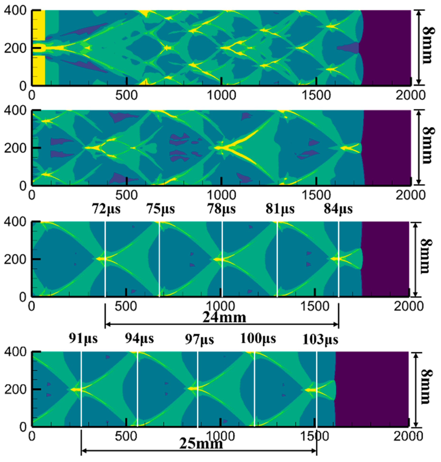 This homemade code was successfully used to simulate detonation in previous studies [30,31]. In this verification study, its capacity to simulate detonation instability is checked and compared with references. The C-J detonation parameters of CFD and theoretical results are listed in Table 5. This code can simulate C-J conditions quantitatively. An ignition delay time comparison of this one-step model (activation energy C = 1.0) with experimental results [32,33,34] and a detailed model [35] of the stoichiometric H2–air mixture is plotted in Figure 16, which demonstrates that this one-step model can simulate the ignition delay time correctly. Two-dimensional numerical simulations are performed to simulate the detonation cell structure (activation energy C = 1.0) and the results are shown in Figure 17. The average length and width of the detonation cell are 12 mm and 8 mm, respectively, which is in good agreement with the experimental results of 15.4 mm and 8 mm, quantitatively [36].