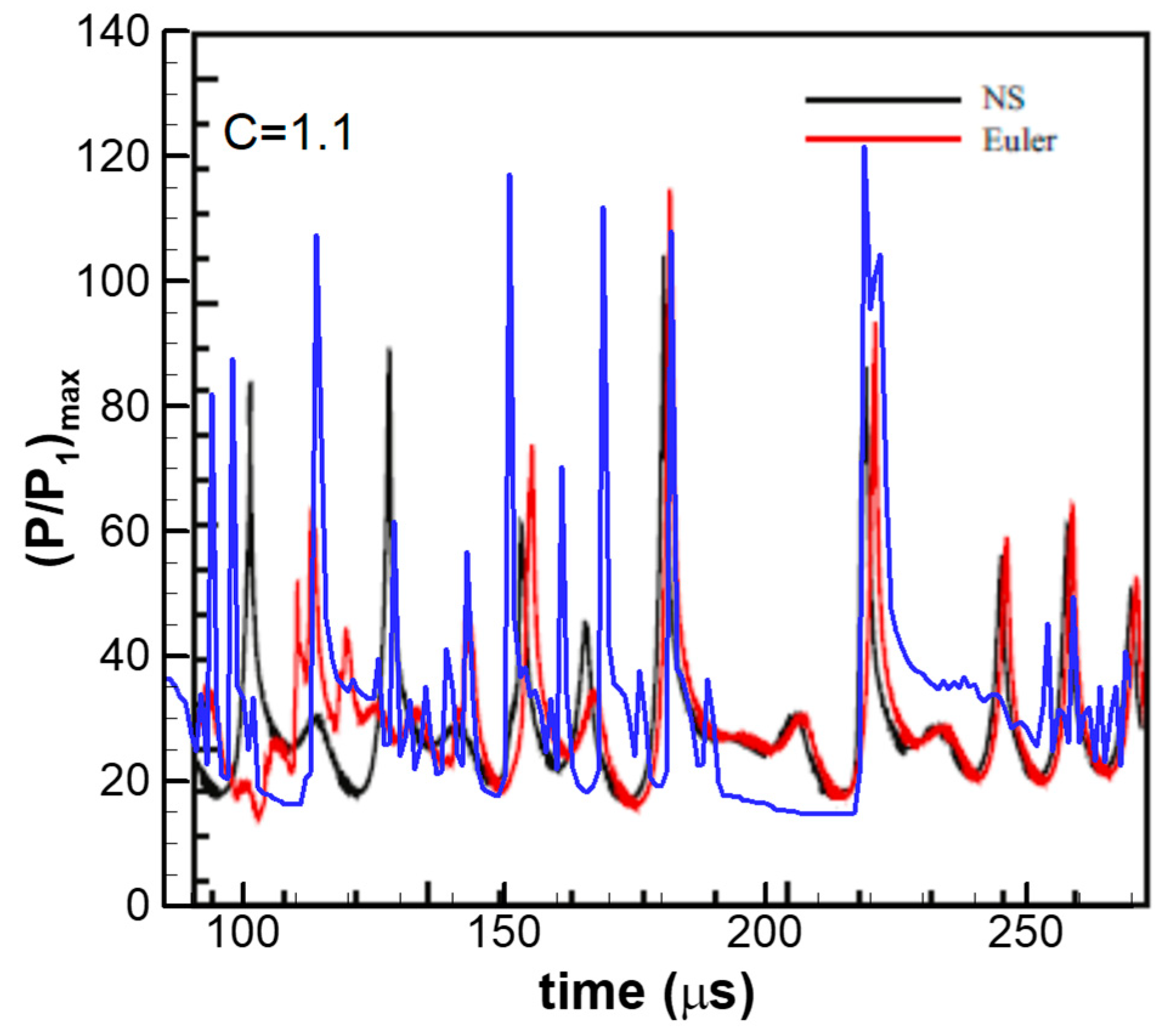 The nonlinear dynamical behavior of one-dimensional detonation was numerically simulated with Euler equations and one-step Arrhenius kinetics by Ng et al. [19]. Their study showed a strong similarity between one-dimensional periodic detonation and simple nonlinear dynamical systems. The maximum pressure ratio of periodic detonation wave (C = 1.0) of this study (red line) is compared with that of Ref. [19] in Figure 18. In addition, the maximum pressure ratio of pulsating detonation (C = 1.1) is compared with that of Ref. [26] in Figure 19. Good agreements are achieved qualitatively.