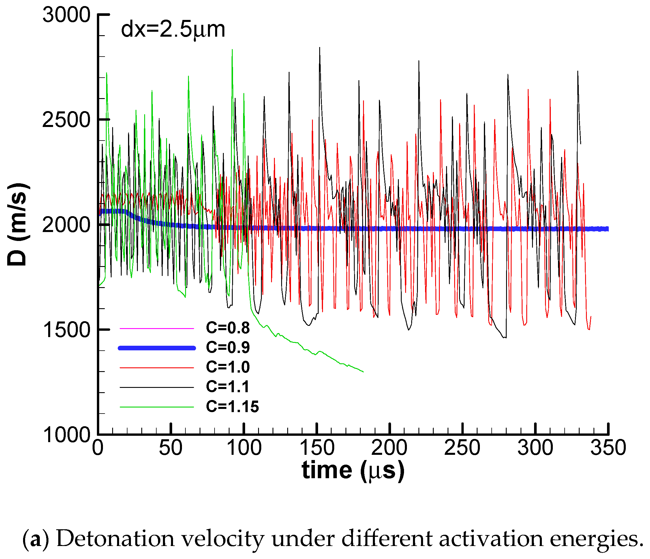 This study reveals that the convective flux plays an important role in the detonation instability. The aim of this resolution study is to demonstrate that this conclusion holds under different grid sizes. The resolution study with a uniform grid size of 2.5 μm was conducted and the velocity under different activation energies is plotted in Figure 20. It can be seen that the three regions of detonation propagation mode—a stable region (C = 0.8–0.9), an unstable region (C = 1.0–1.1), and a quenching region (C ≥ 1.15)—are reproduced successfully.