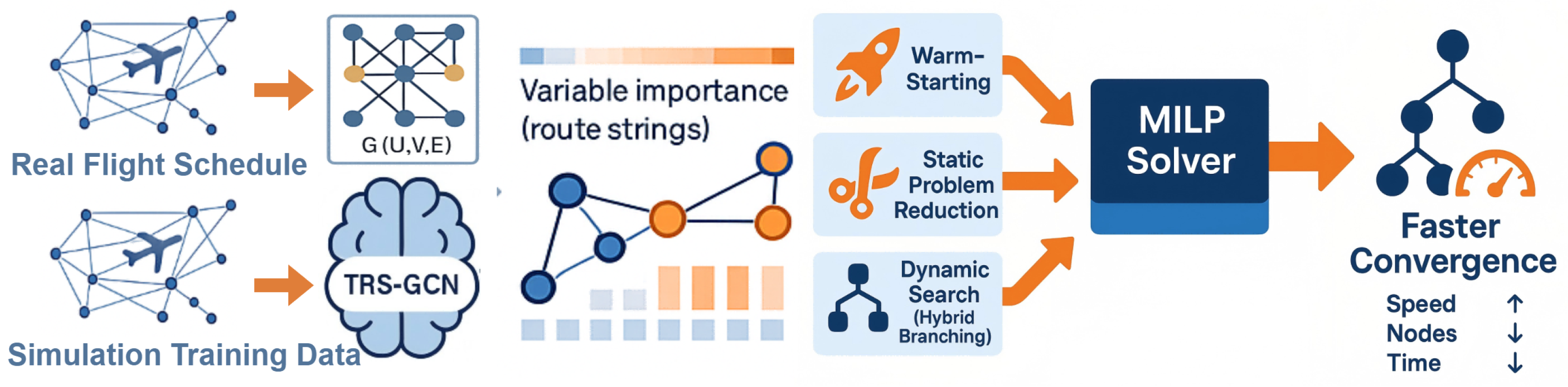 In the hybrid optimization framework for the ARP proposed in this study, the core prediction task associated with the TRS-GCN is the quantification of flight string usefulness. This task aims to accurately determine the probability that a particular flight string will be included in the optimal solution of the ARP (with the imitation target being the optimal solution of generated simulated ARP instances) and its potential to improve the objective function. This task is not only crucial for reducing the variable dimension of Mixed-Integer Programming (MIP) and alleviating enumeration redundancy but also provides a foundation for variable elimination in the subsequent presolve procedure and strong branching ordering in the Branch-and-Bound (B&B) process. The heterogeneous correlation of its multi-modal features (including the newly added linear programming-related mathematical features) has motivated the design of TRS-GCN to adapt to the complex dependency relationships inherent in the problem.