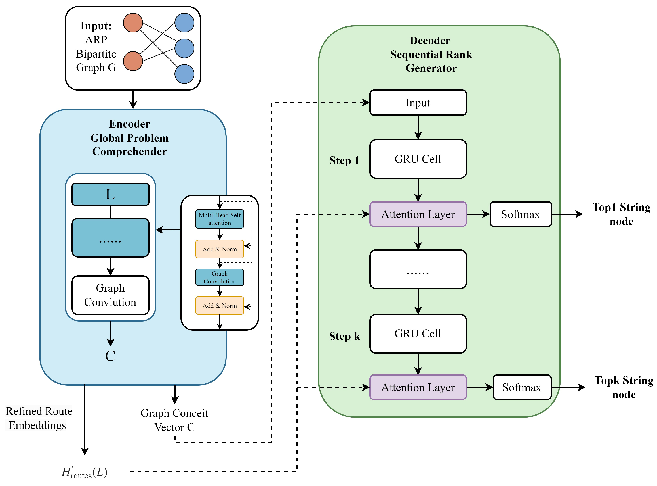 Figure 3, the TRS-GCN architecture is based on an encoder–decoder framework. The encoder, a deep graph neural network, is responsible for comprehending the complex structure and features of the Aircraft Routing Problem (ARP) instance, represented as a bipartite graph. The decoder, a recurrent neural network equipped with an attention mechanism, then utilizes this comprehensive understanding to sequentially identify and rank the most salient variables (flight strings).