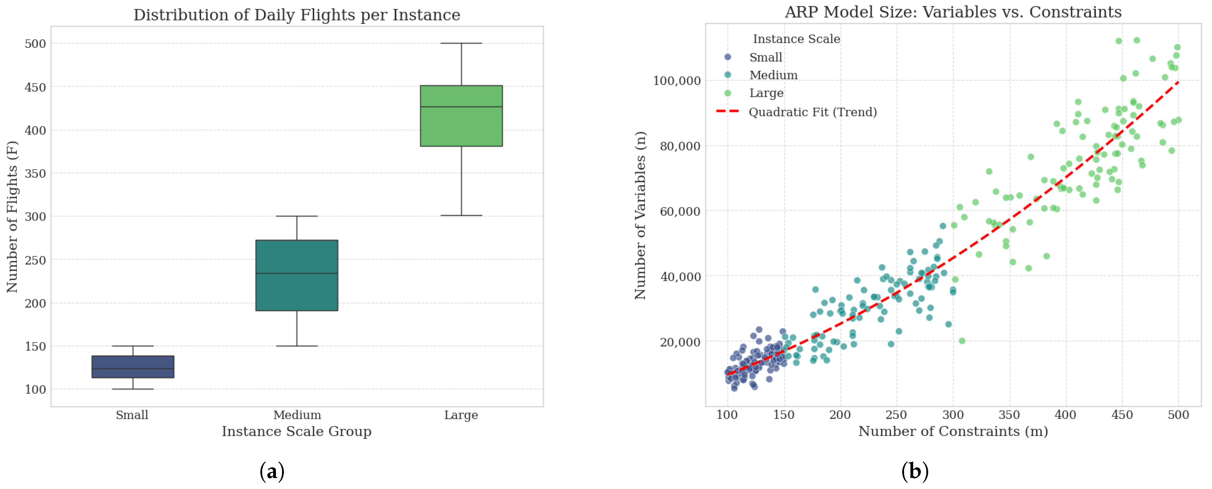 The seed solution guarantees feasibility. Adding noise columns does not destroy feasibility. The probability of selecting flights depends on the hub weights , which leads to higher degrees for flights connecting to hub airports. The bucket-based sampling process and minimum turnaround time enforce realistic temporal sequencing. The parameter controls the likelihood of staying within the same time bucket. The parameters , , and jointly control the redundancy and correlation of columns, thus shaping the difficulty of the SCP instance without sacrificing feasibility. The parameter enforces a constraint that every route must contain at least one maintenance flight.