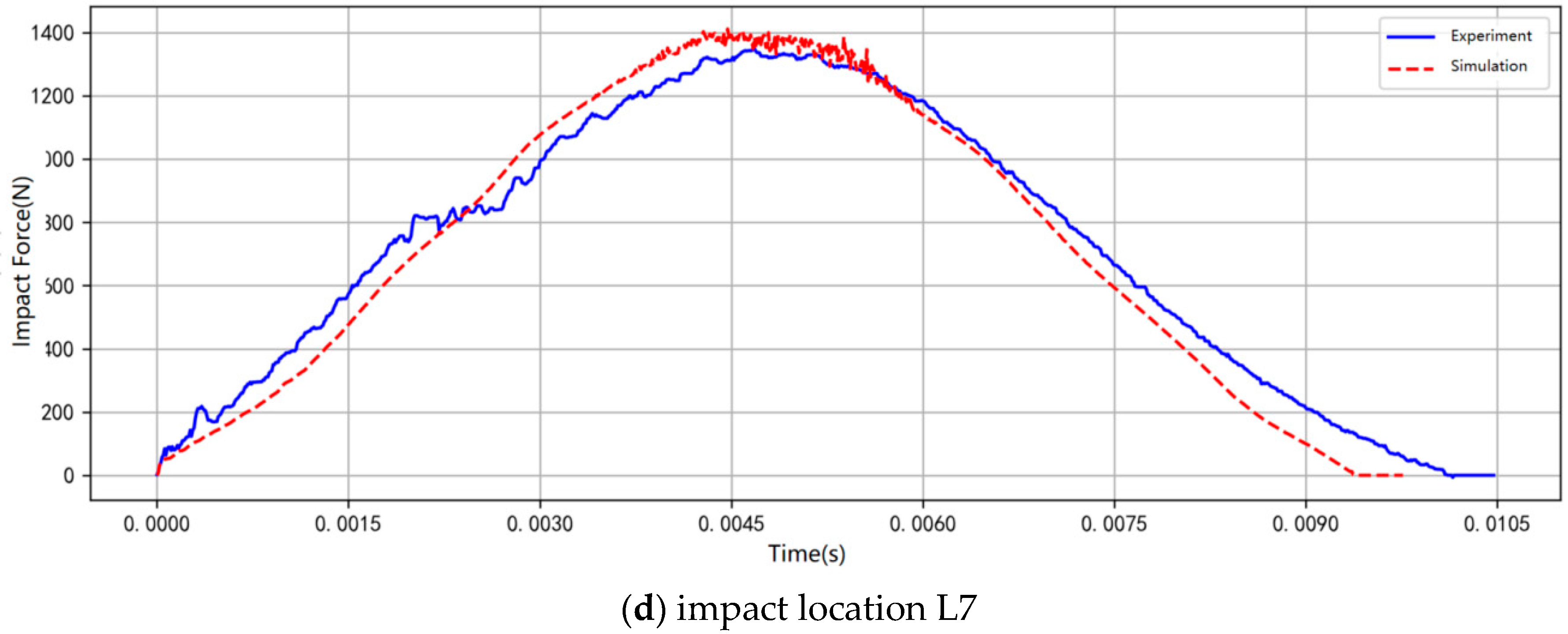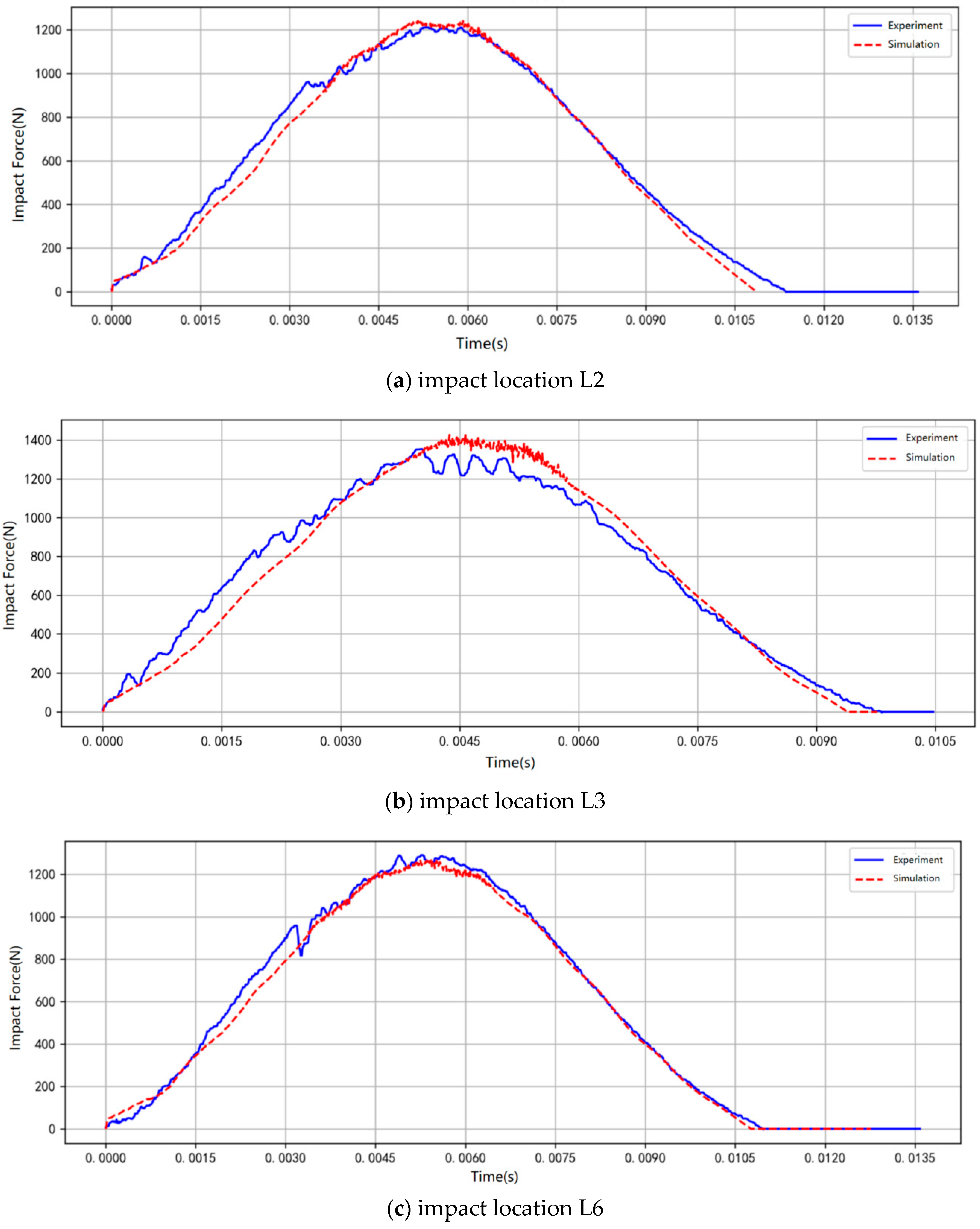 This study has developed a simulation modeling approach to analyze CLs, specifically focusing on their impact responses during low-velocity impacts. The correlations between impact responses and various parameters, including IE and location, have been methodically analyzed. Repeated low-velocity impact tests were conducted on CLs at different locations, recording the impact force responses, which were then compared with the outcomes from simulations. The key findings are as follows: